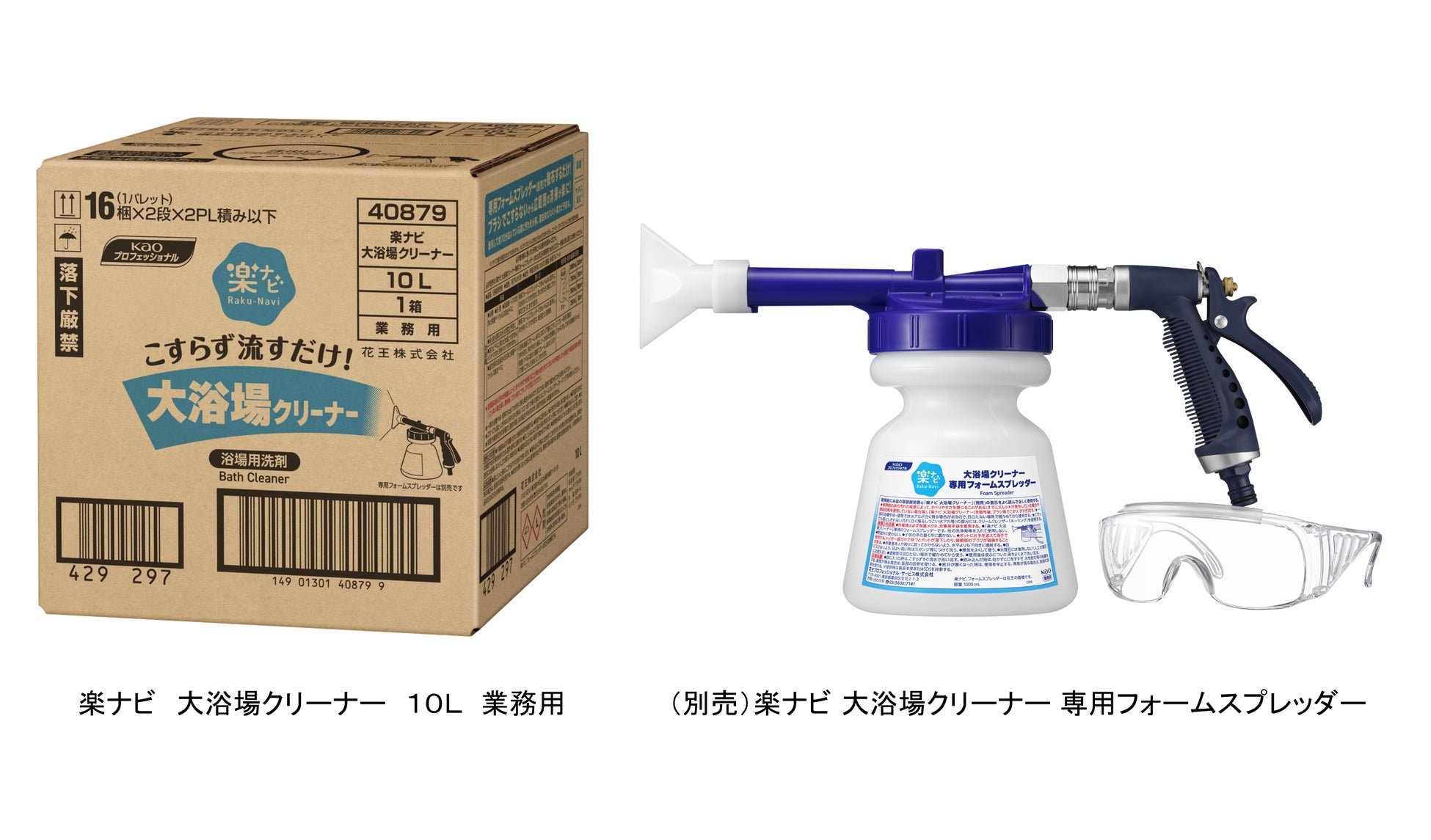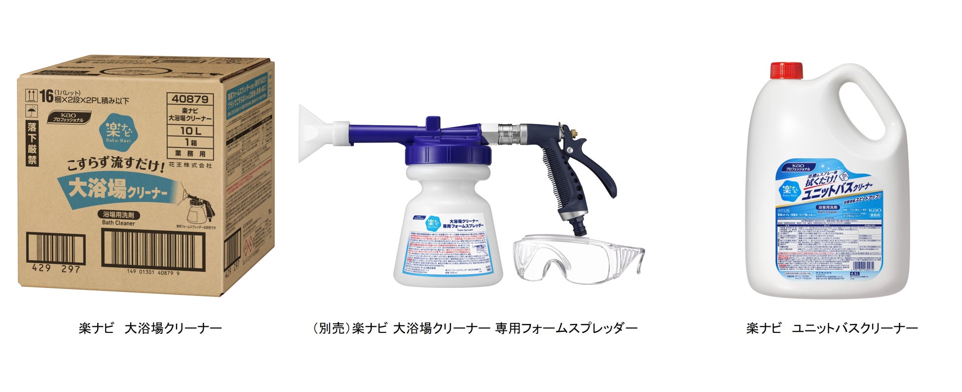 また、ビジネスホテルやシティホテルなどの客室内の浴室清掃には、浴槽にスプレー後タオルで汚れを拭き取るだけの浴室用洗剤「楽ナビ ユニットバスクリーナー」を提案します。ビジネスホテルやシティホテルの浴室清掃特有の仕上げの水滴拭き上げ工程から着想を得た、新たな清掃オペレーションです。浴槽の清掃は、スポンジによるこすり洗いや洗剤のすすぎが不要となり、清掃負担軽減と時間短縮、水使用量の削減が期待できます。トイレや洗面台、コップ類にも使えるので洗剤の使い分けが不要となり、1本でユニットバスの清掃に対応できます。