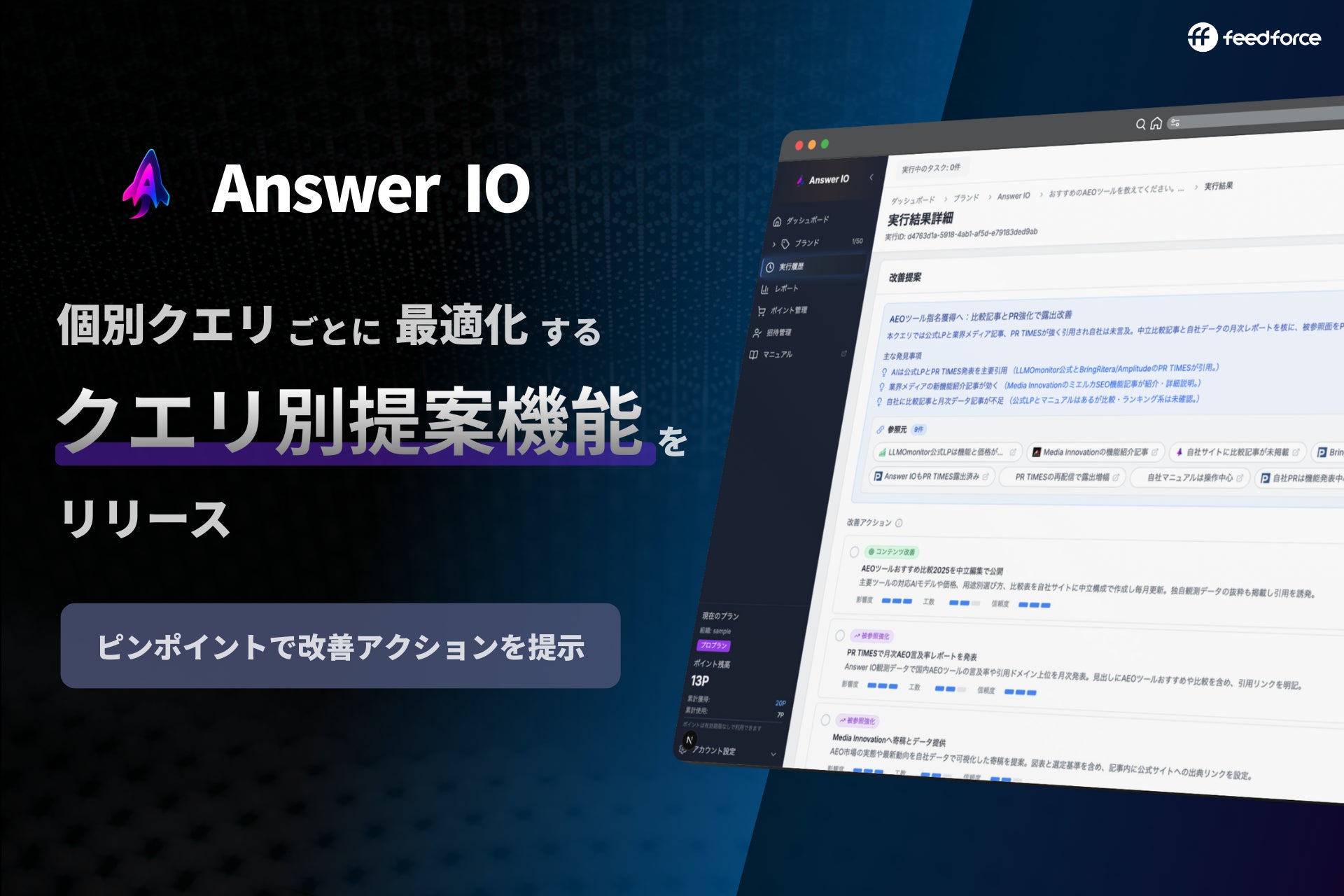 株式会社フィードフォース(本社:東京都港区、代表取締役社長:塚田 耕司、以下「フィードフォース」)は、AI検索におけるブランドスコアを見える化する「Answer IO」に、クエリ別AI改善提案機能を追加しました。本機能は、個別のクエリ実行ごとにAIが詳細な改善提案を自動生成し、より具体的で実行可能な施策を提示します。これにより、従来のレポート全体に対する包括的な改善提案に加え、個別クエリに特化した詳細な最適化が可能となり、AI検索からのブランド流入を効率的に強化できます。