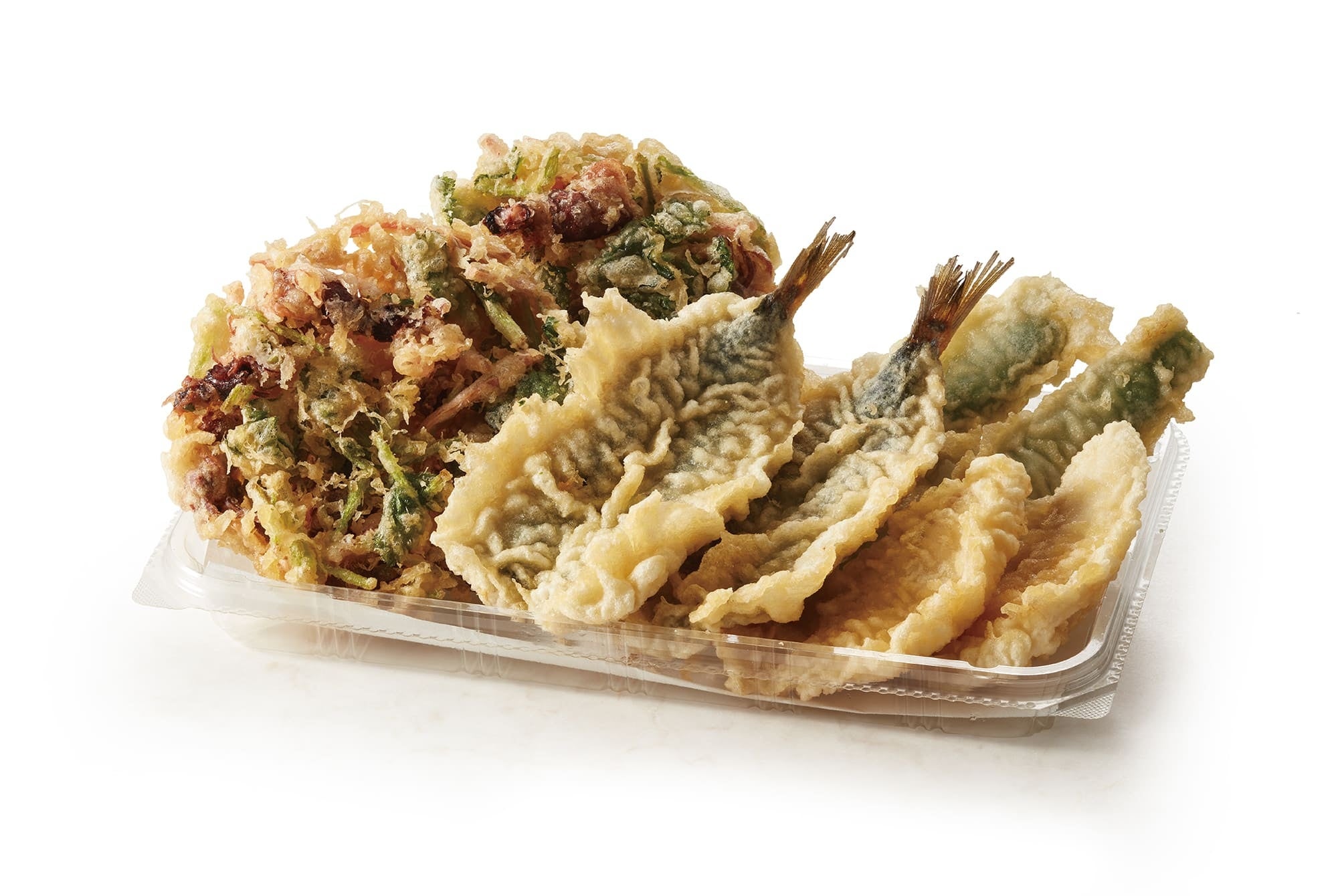 内容:銚子産真いわし、ほたるいかのかき揚げ(三つ葉と紅しょうが入り)、 国産ヒラメ、ひらさやいんげん