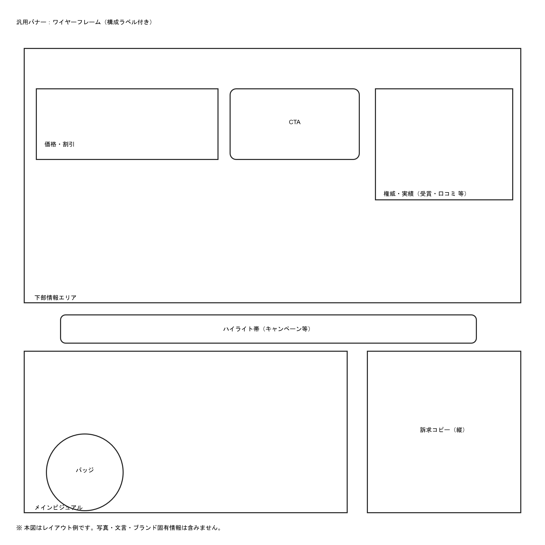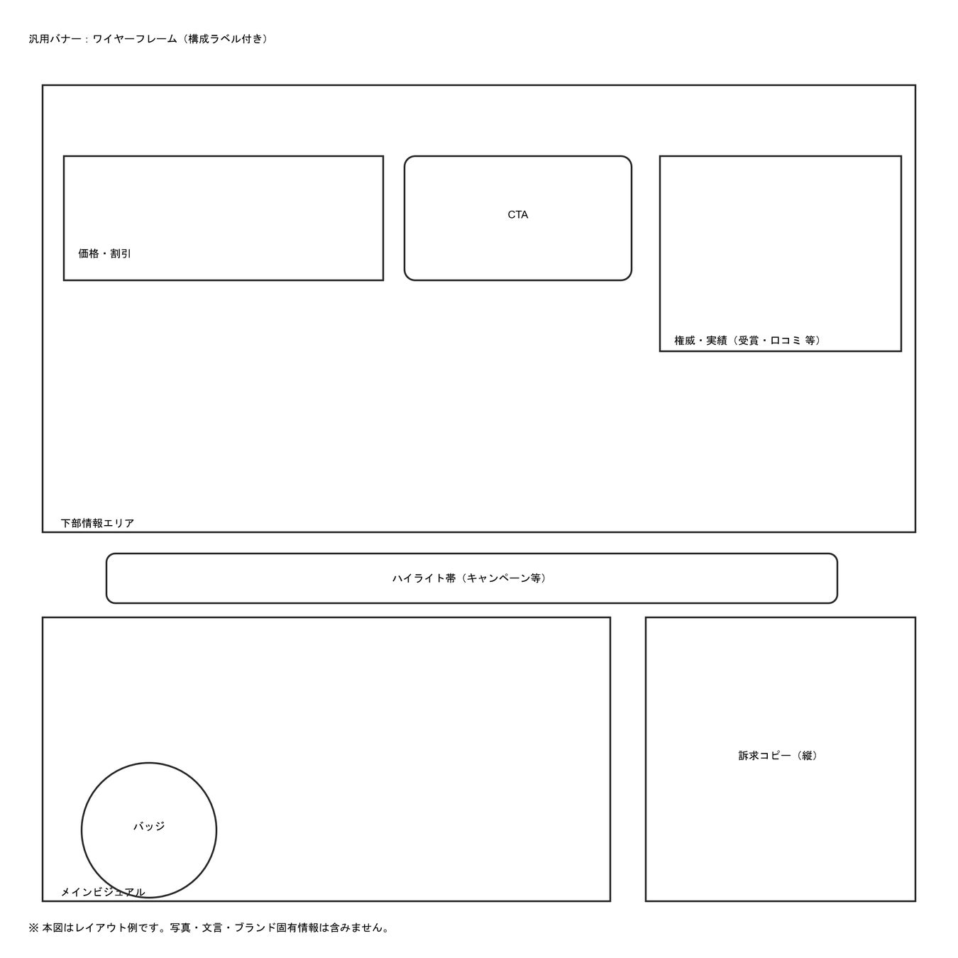 ※テンプレートは媒体仕様(9:16/1:1/16:9・安全域・文字量)に合わせて派生を用意。勝ち要素の差し替え(価格・実績・FAQ・返金保証など)を前提としたモジュール構造です。