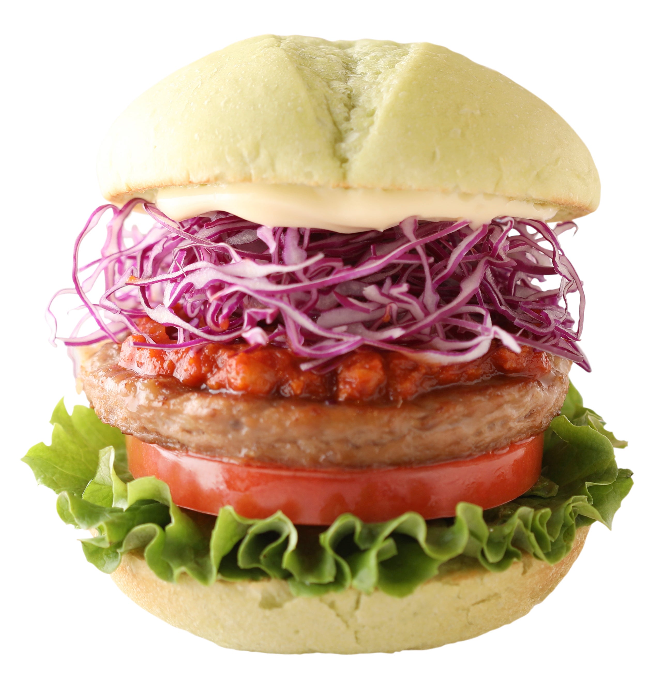 牛肉のパティにグリーンリーフとトマト、レッドキャベツ、マヨネーズタイプとトマトのソースを合わせ、「MOS PLANT-BASED」シリーズの緑色のバンズで挟みました。緑色のバンズは、ほうれん草パウダーを練りこむことで、ほんのりとした野菜の甘みを感じていただけます。牛肉の食べ応えのあるパティとたっぷりなみずみずしい野菜がよく合うハンバーガーです。大豆由来の植物性たんぱくでお肉を再現した「ソイパティ」に変更することも可能です。