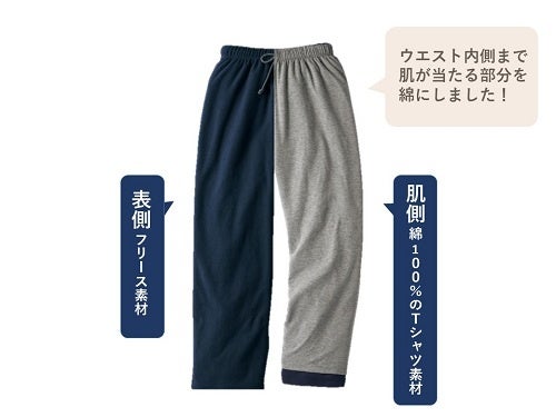 そこで開発したのが「肌側綿100%裏地付きフリースパンツ」。アウターで人気の「裏付きパンツ」をヒントに、表側はフリース、肌側は綿100%の二重仕立てを採用。