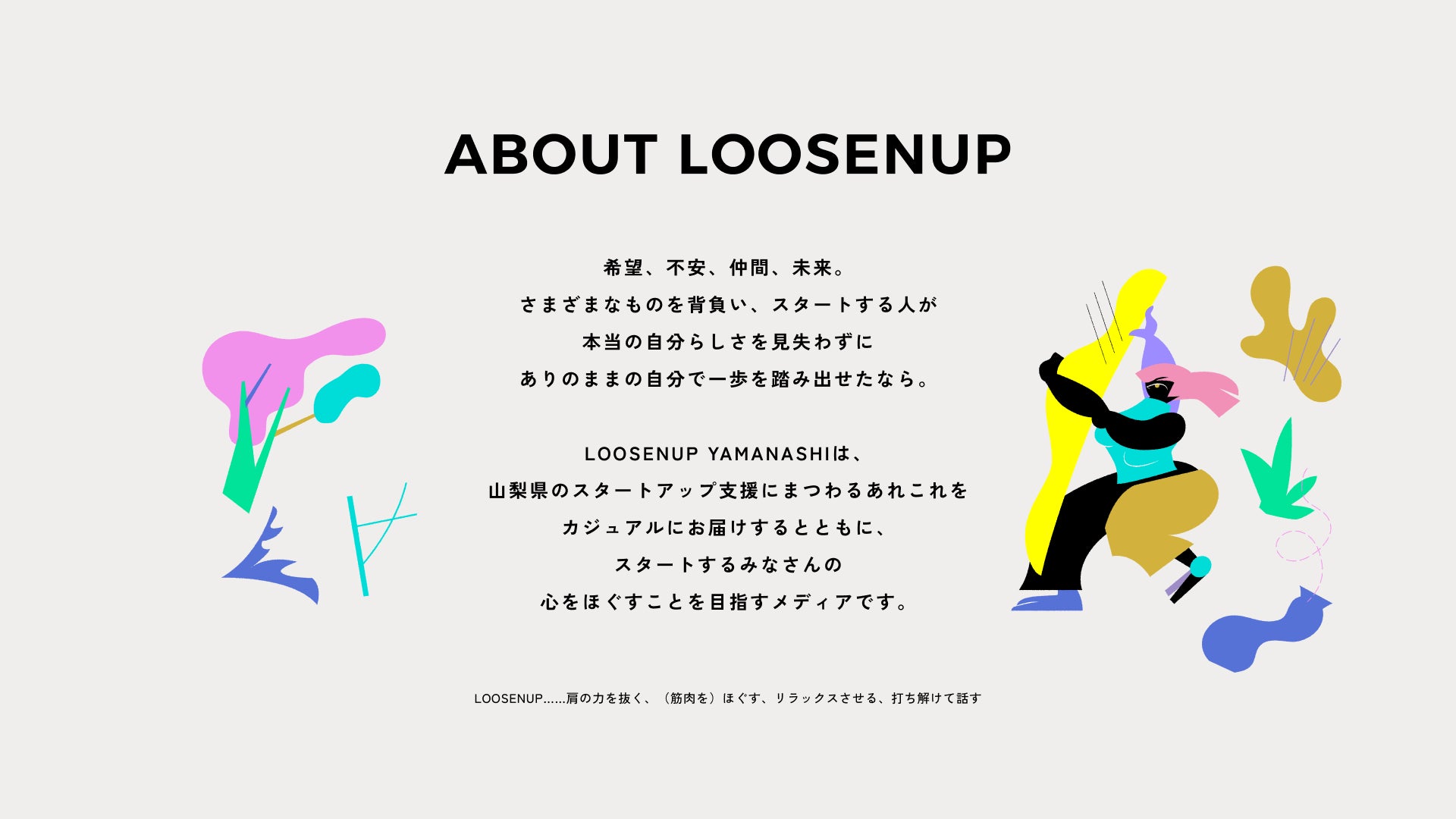 希望、不安、仲間、未来など、さまざまなものを背負い、日々進みつづけるスタートアップのみなさんに、もっと肩の力をぬいて、山梨に頼ってもらえるような関係性をつくりたいという想いから「LOOSENUP」をコンセプトワードとしました。