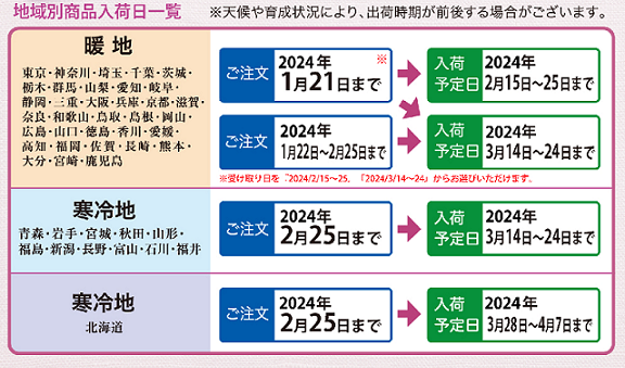 ※暖地では2024年1月21日までのお申し込みで、受け取り日を『2024年2月15日~25日』と『2024年3月14日~24日』からお選びいただけます。