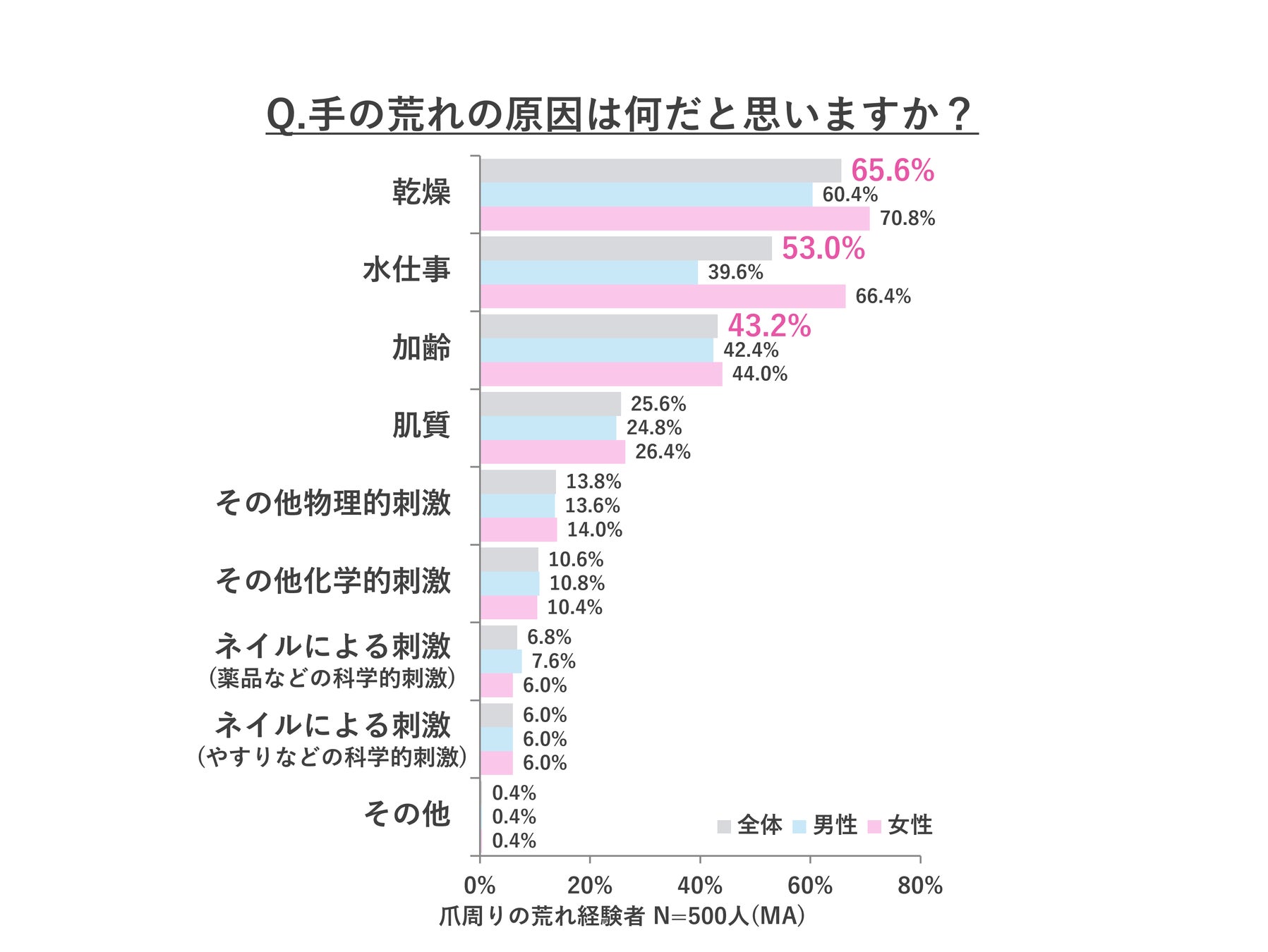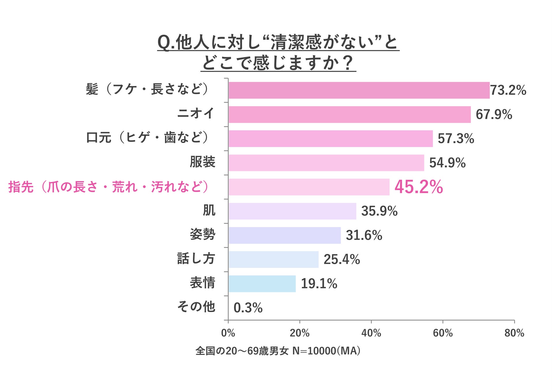 1.他人の指先で気になるところは、男女ともに「皮膚の荒れ」が最多 指先の印象はその人の印象にも関わる「指先の身だしなみ」が重要!