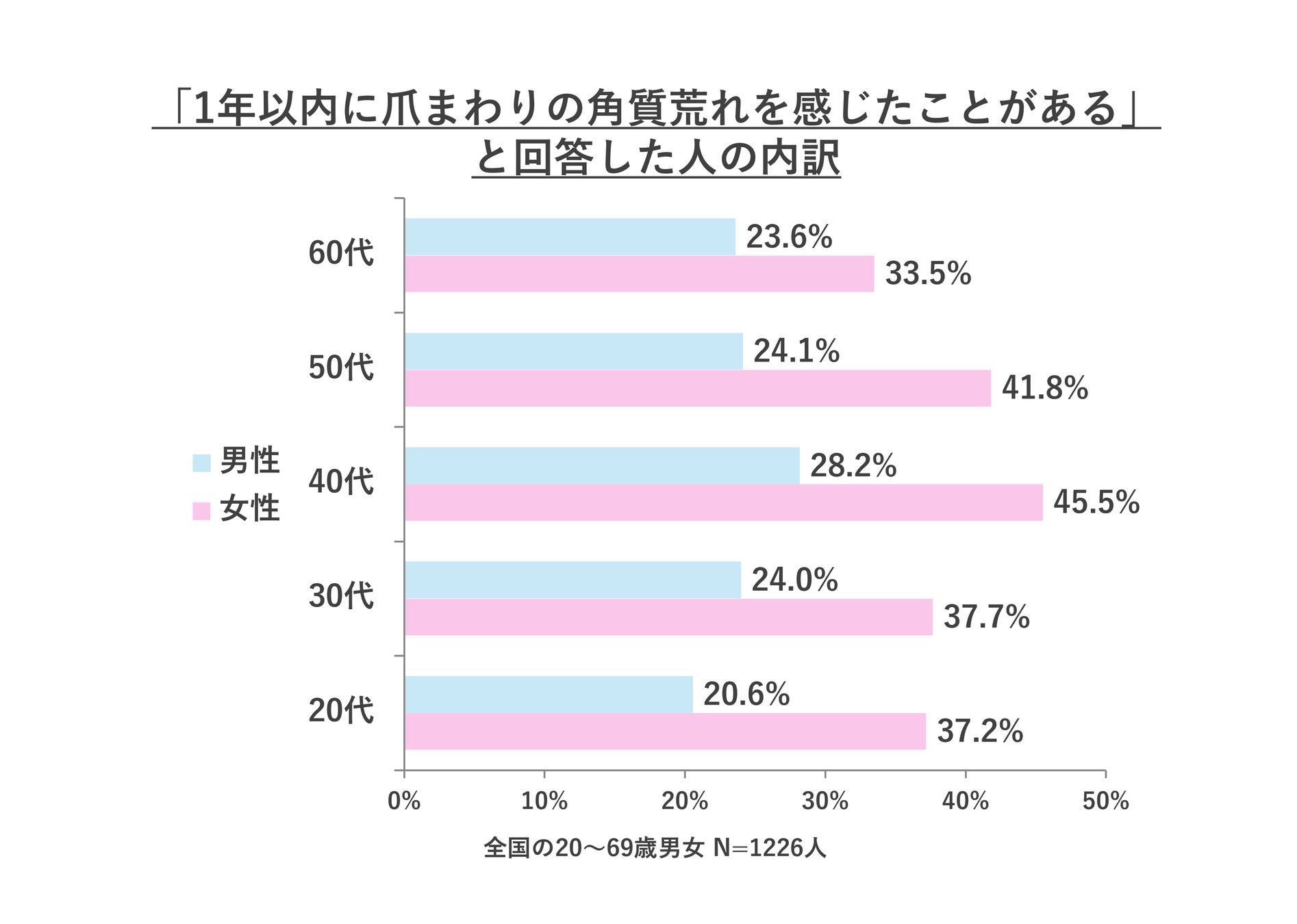 他人の指先で気になるところとして挙げられた中では、爪のデザイン性や形、ツヤ、長さなどの要素ではなく「皮膚の荒れ」が男女共に最も多い結果となりました。女性はジェルネイルやマニキュアなどでデザイン性等を求める人が一定層いるものの、皮膚の荒れに関しては多くの人が関心を持っていることが分かりました。