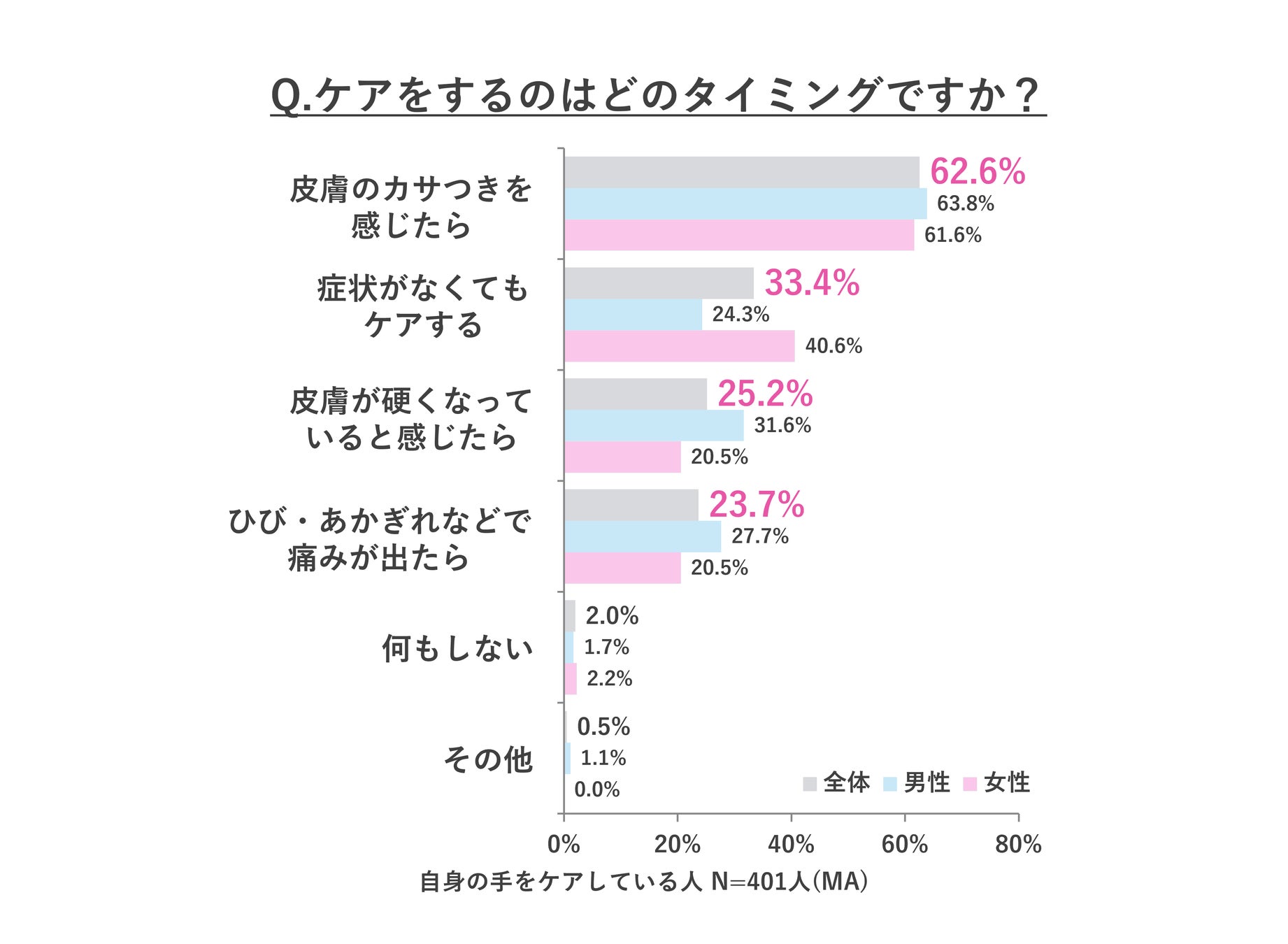 手のひらや甲の手荒れの原因は、上位から「乾燥(65.6%)」、「水仕事(53.0%)」、「加齢(43.2%)」という結果になりました。男女別で見ると「水仕事」は男性39.6%、女性66.4%と、原因によっては性別で大きく差が開くものもありました。同じく手のひらや甲をケアするタイミングについては、上位から「皮膚のカサつきを感じたら(62.6%)」、「症状がなくてもケア(33.4%)」、「皮膚が硬くなってきていると感じたら(25.2%)」、「ひび・あかぎれなどで痛みがでたら(23.7%)」という順に。男女別でみると、女性は予防的に、男性は支障が生じたらケアする傾向にあることが判明しました。