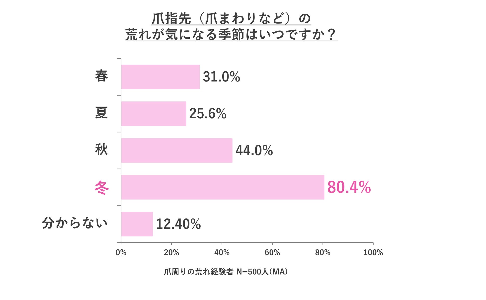 本調査によると、冬場は約8割の人が手・指先の荒れに悩む季節であることが判明しました。また、指先の荒れ・意識については、年代間・性別間でギャップもあることが分かりました。