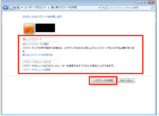 「パスワードのヒントの入力」では、必要に応じてパスワードを思い出すためのヒントを入力します。入力後、「パスワードの作成」をクリックします。