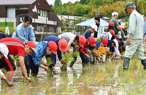 樫田小学校は高槻市北部山間地域に位置する、今年で創立150年を迎えた歴史ある学校。豊かな自然に恵まれた環境と小規模校の特徴を生かし、児童にたくましく心豊かに育ってほしいとの思いから、樫田地域の豊かな自然や文化・歴史を取り入れた学習を行っていて、一定の条件の下、他の校区からでも入学・転入が認められる「特認校」制度を平成15年から採用するなど、特色のある学校として知られています。樫田小学校の田植え体験は、小規模校の利点を生かし、全校児童53人が一斉に実施することで、学年同士のつながりを感じながら体験できることが他校にはない大きな特徴。毎年、同校近隣にある約4アールの学習田を活用し、近隣農家や保護者の方々も協力して実施しています。当日、児童たちは、水の張られた田んぼに入り、農家の方からの「根本を鉛筆のように持ちながら植えていってください」などのアドバイスを受けたあと、キヌヒカリの苗を植えていきました。初めて田植えを行う1年生は、最初は難しそうにしていたものの、慣れた手つきの上級生や学校の教職員、地域の方々などに教えてもらいながら田植えの方法を覚え、最後には上級生と一緒に笑顔で楽しんでいました。「慣れてきて楽しい」と話す児童や「面白かったので、来年もまたやりたい」 と意気込む児童などもいて、みんな汗を流し楽しみながら田植え体験をしていました。今後は成長を観察して、秋になると児童たちが刈り取る予定になっています。