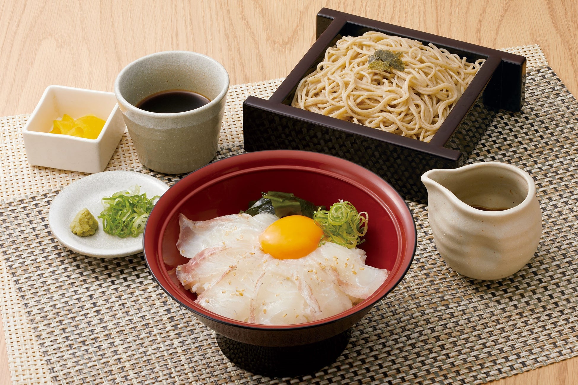 高知県産の真鯛は程よい甘みが特徴で鯛めし用のタレと玉子を混ぜておめしあがりください。セットの麺はそば又はうどん(温・冷)がお選びいただけます。