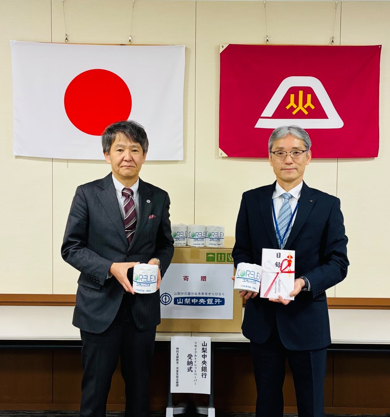 株式会社山梨中央銀行(頭取 古屋 賀章)は2月27日(金)、地域社会貢献への取組みの一環として、山梨県内の特別支援学校14校の皆さまへ、当行内で使用された紙文書を再生利用した「リサイクルトイレットペーパー(5,000ロール)」を贈呈しました。