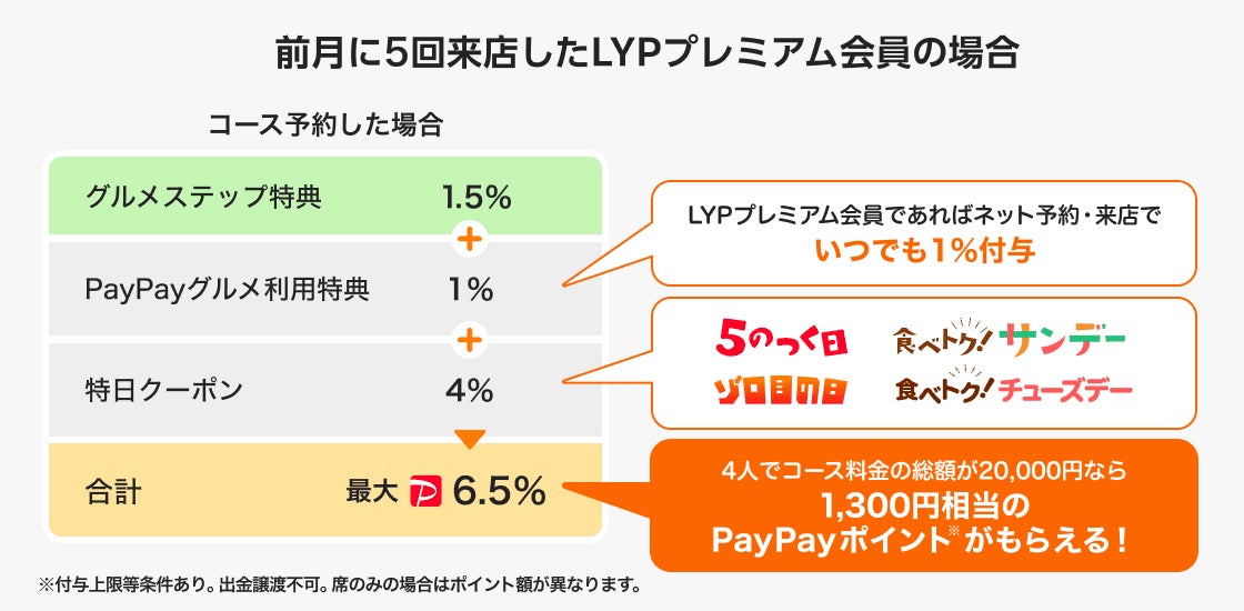 「PayPayグルメ」利用特典としてご利用料金の1%(通常会員はご利用料金の0.5%)、さらに予約日が、火曜日、日曜日、5のつく日(5日、15日、25日)、ゾロ目の日(11日、22日)だと4%追加となり最大6.5%の「PayPayポイント」がもらえます。