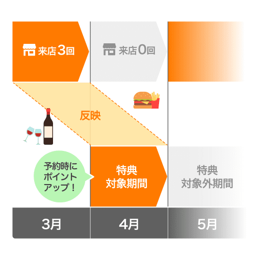 例えばコース予約の場合、2024年3月に5回以上予約・来店をすると、2024年4月におこなう予約では、ご利用料金の1.5%の「PayPayポイント」がグルメステップ特典としてもらえます。