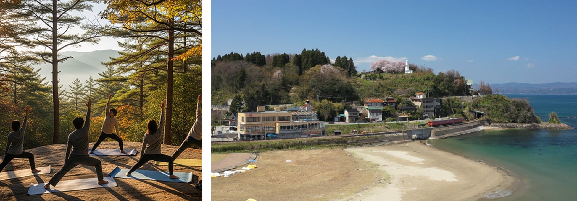 ツアーでは、パノラマ風景を眺望することや伏木や灯台について学びを深める歴史ガイドや、普段入ることのできない岩崎ノ鼻灯台を登頂、そして非日常の場所にて簡単ヨガを行います。