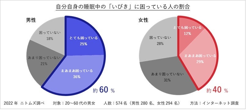 - いびきの悩みは、男性が女性に比べて多い傾向