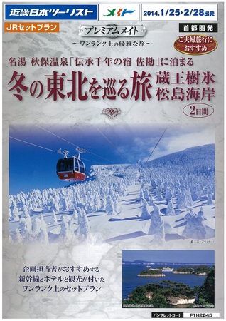 1日目:東京駅 →(山形新幹線)→ 山形駅 = 蔵王山麓駅 ~(ロープウェイ)~ 地蔵山頂駅 (蔵王樹氷見学)~(ロープウェイ)~蔵王山麓駅 = 秋保温泉「伝承千年の宿 佐勘」