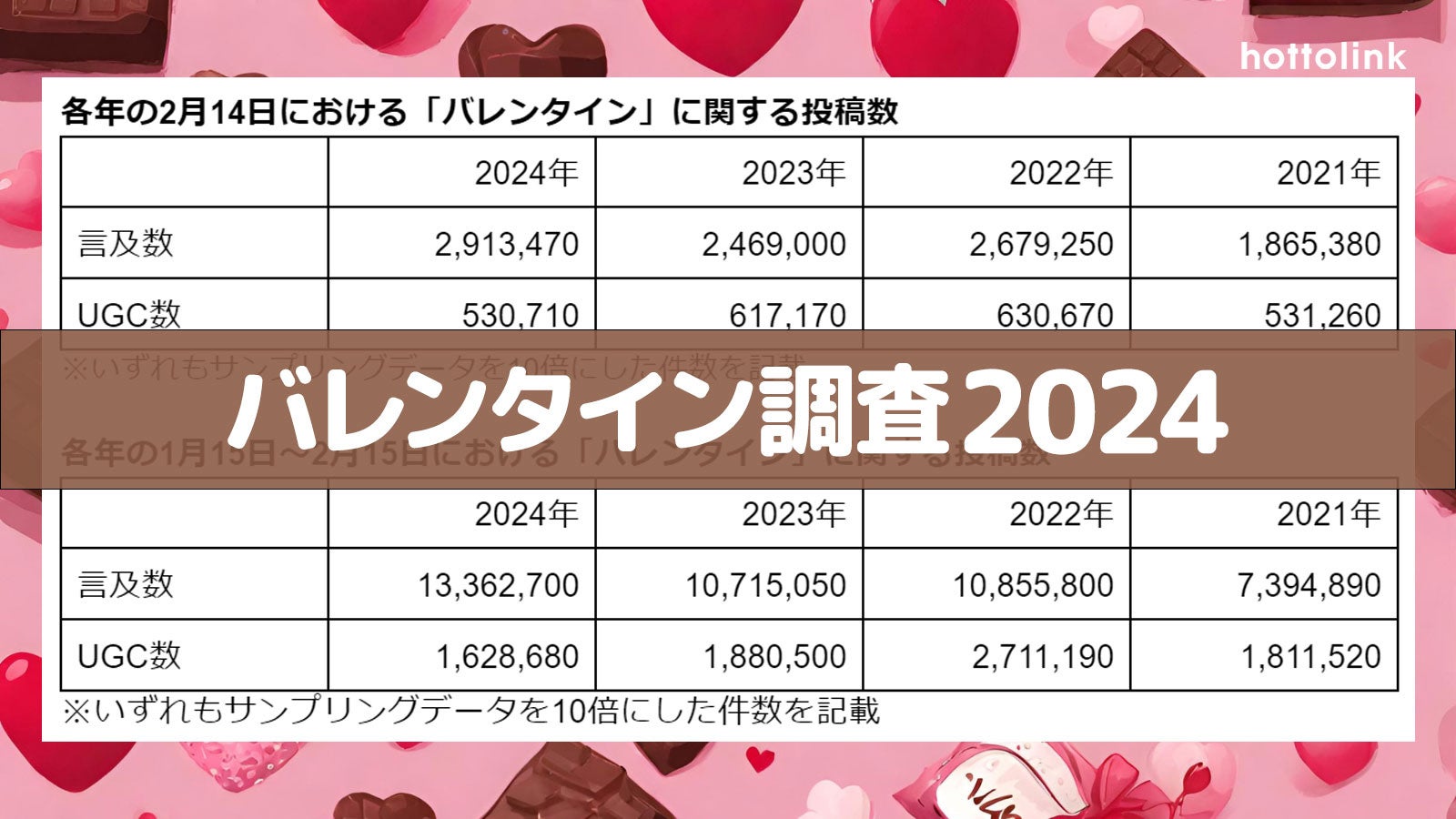 SNSマーケティング支援サービスを提供する株式会社ホットリンク(本社:東京都千代田区、証券コード:3680、代表取締役:内山幸樹、以下ホットリンク)は、X(旧Twitter)のデータを分析し、Xに投稿されたバレンタインに関するUGCを調査しました。