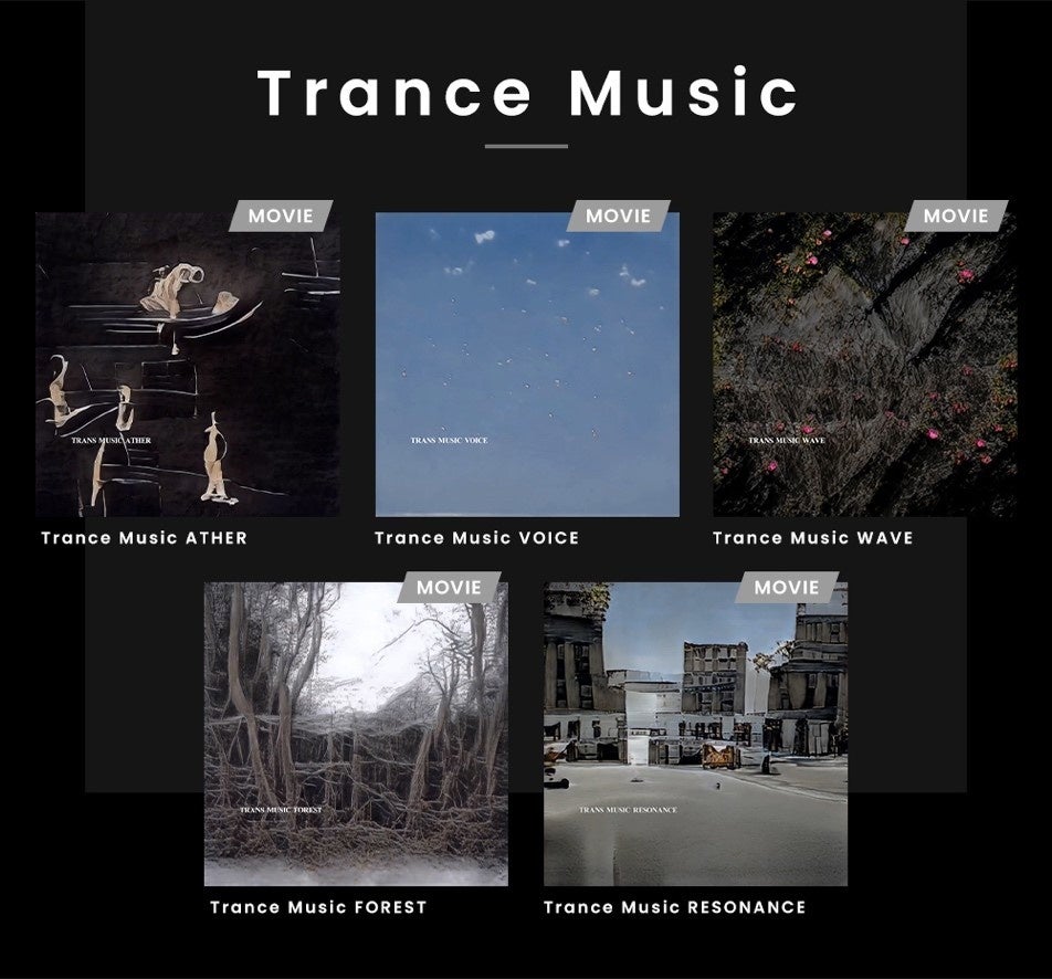 「Trance Music」シリーズは柿本ケンサクが撮影した風景写真を海、山、植物、ミクロとマクロなど10の性格に分類し、分類した写真をAIに機械学習させたのち、浮かびあがった映像に音楽をシンクロさせた作品で、