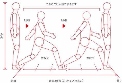 大股で2歩歩いた長さを測定します。年代別の平均値とご自身の結果を比較することで、ご自身の現在のロコモティブシンドロームの進行度を知っていただくきっかけとなります。
