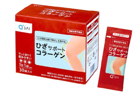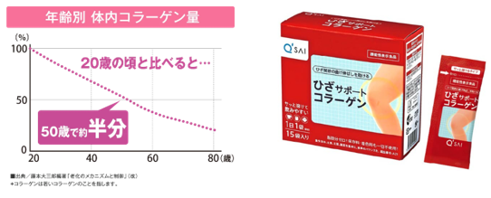 当社のひざサポートコラーゲンは、ひざ関節の曲げ伸ばしを助ける機能性表示食品です。ひざの曲げ伸ばしに重要なコラーゲンは年齢と共に減少し、20代に比べると50代では約半分まで減少するといわれています。日々必要な成分を取ることができるので、ひざの曲げ伸ばしに不安がある方や健康的なひざを維持したい方におすすめの商品です。