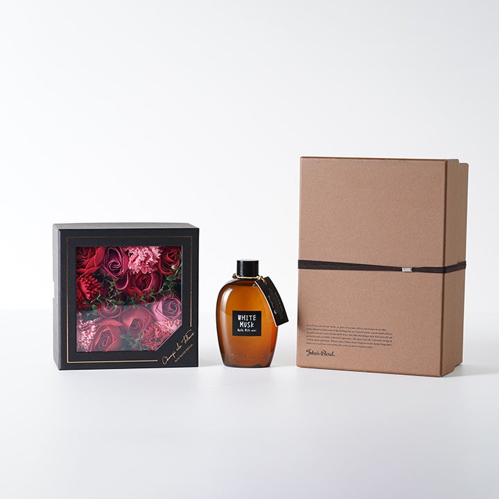 (右)シャリテローズ フラワーバスペタル John's Blend ボディクリームソープ ギフトボックスセット/¥4,840(税込)