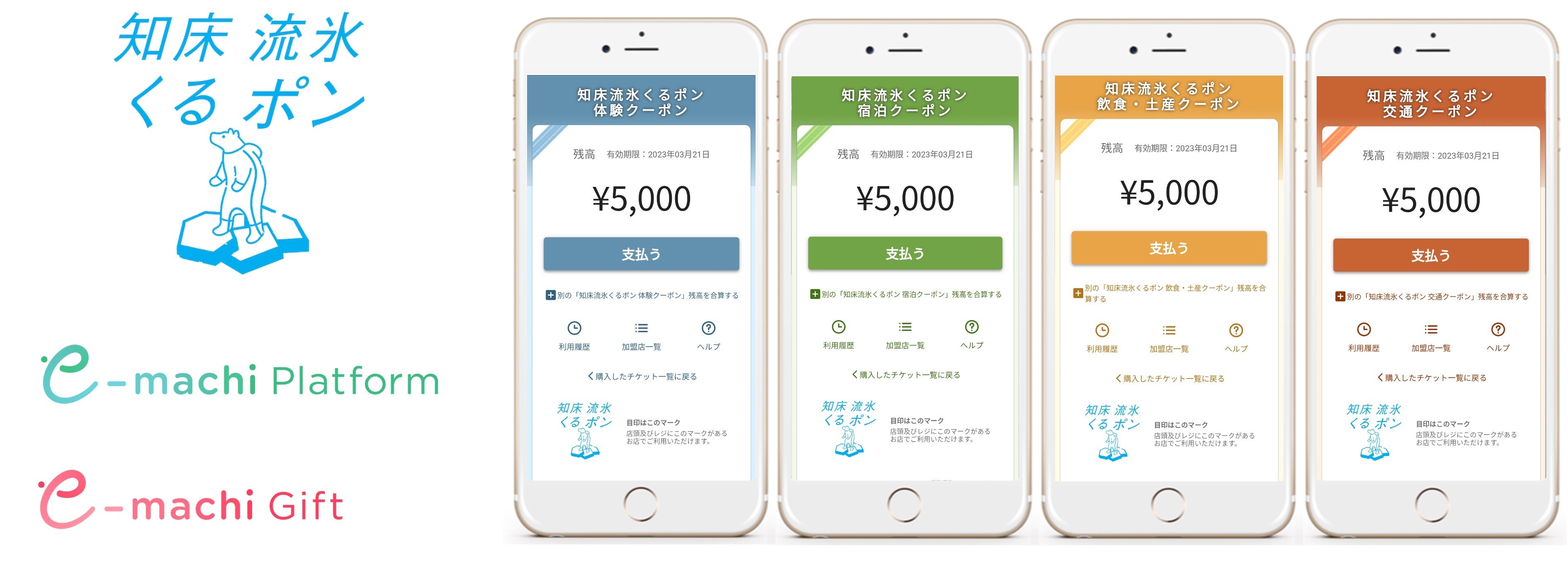 eギフトプラットフォーム事業(※1)を展開する株式会社ギフティ(本社:東京都品川区/代表取締役:太田 睦、鈴木 達哉/以下、ギフティ)が提供する、自治体・地域の課題を解決するデジタルプラットフォーム「e街プラットフォーム®」(※2)を、特定非営利活動法人知床斜里町観光協会(所在地:北海道斜里町/代表者:野尻 勝規/以下、知床斜里町観光協会)が、斜里町役場からの委託を受けて実施する「知床流氷くるポン」事業に採用いただきましたので、お知らせいたします。これに伴い、同町の加盟店で利用可能な、宿泊、体験、飲食・土産、交通の使途の異なる4種の電子商品券の発行が、2023年1月16日(月)より開始されました。本電子商品券は、既に旅行者向けのプレミアム付き電子商品券としての一般販売、および電子商品券付きの旅行プランとしての販売を開始しており、2023年2月26日(日)からは、対象の宿泊施設に宿泊する18歳から29歳までの旅行者を対象とした「知床流氷くるポン 若者応援クーポン」としても無料配布を開始しております。なお、本事業は、2022年11月に開始し現在も実施中の「まんぷ食うポン・デジタル」事業(※3)に採用をいただいた同プラットフォームの仕組みを利活用するモデルとなっています。