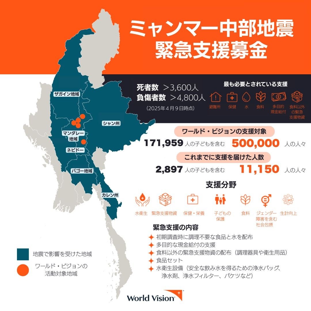 世界の子どもを支援する国際NGOワールド・ビジョンは、3月28日にミャンマーで発生した大地震の被災地域で、4月9日までに2,897人の子どもを含む11,150人の人々に支援を届けました。