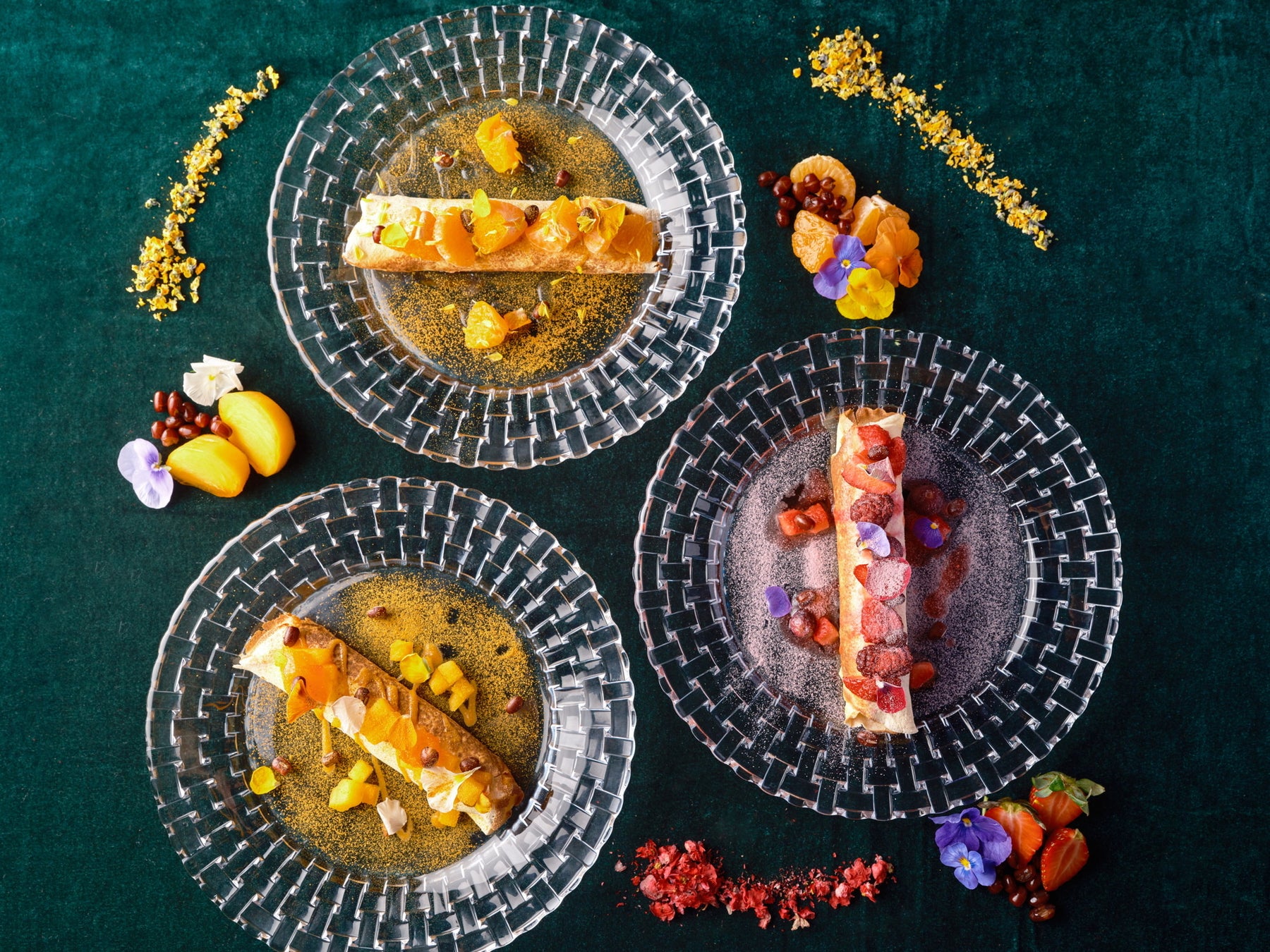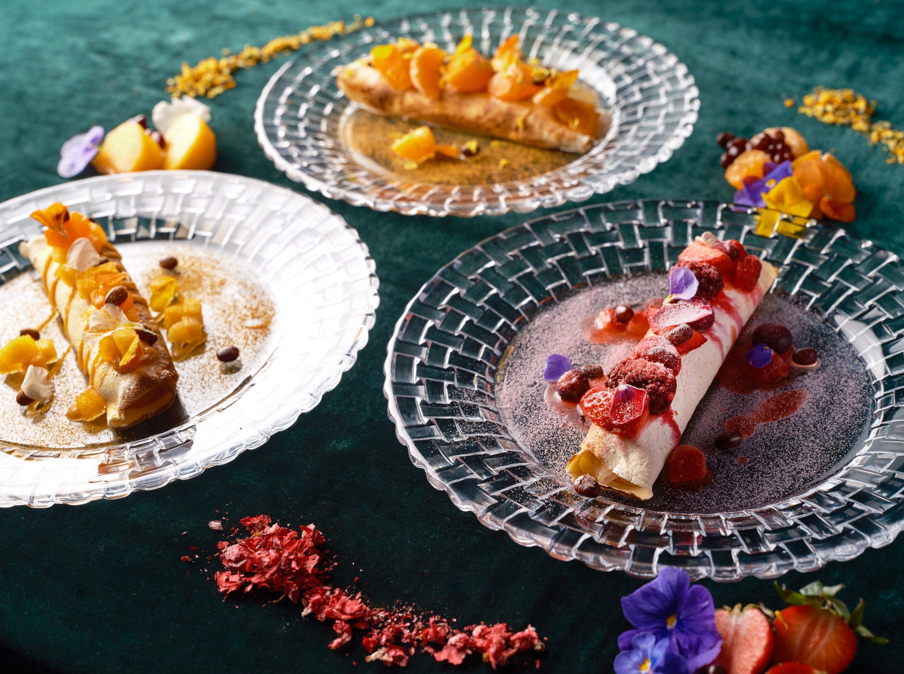 この冬は、人気の和菓子「フルーツ大福」に、フランスの定番スイーツ「クレープ」を掛け合わせたフレンチシェフこだわりのオリジナルハイブリッドスイーツ「à la daifuku ?」3種をご用意。フルーツと小豆、カスタードクリームを求肥で包み込み、クレープ生地でさらに巻き、表面をこんがり焼き上げました。ラム酒が程よく効いたカスタードクリームはフレンチシェフならではのこだわりの味です。フルーツは冬の味覚のいちご、みかん、あんぽ柿の3種からお選びいただきます。それぞれ異なる素材を加熱することで一体感が生まれ、焼き上げたクレープ生地がパリッと香ばしく、食感に飽きのこない逸品です。大きめにカットされたフルーツやエディブルフラワーで飾られた華やかなビジュアルが目を引く、見た目はクレープ、食べるとまるで大福の新感覚のスイーツです。