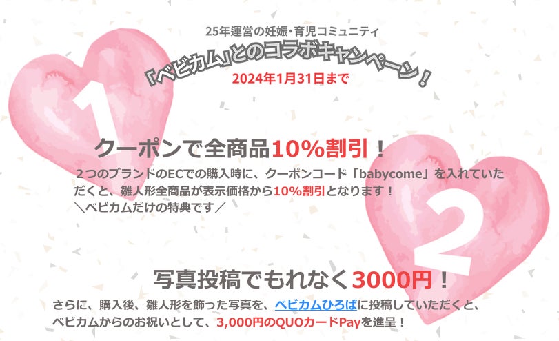 ベビカム株式会社(本社所在地:東京都千代田区、代表取締役:安西正育)は、雛人形の製造で、伝統と信頼を誇る2つのブランドである、木目込み人形の「真多呂人形」と衣装着人形の「人形の喜峯」とコラボレーションを行い、お得な特別キャンペーンを1月31日まで実施します。