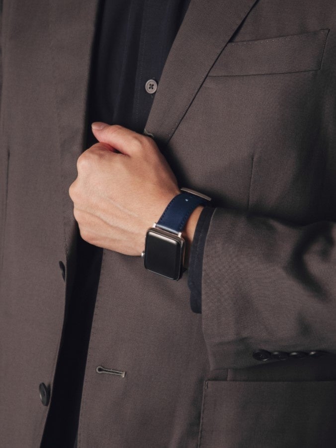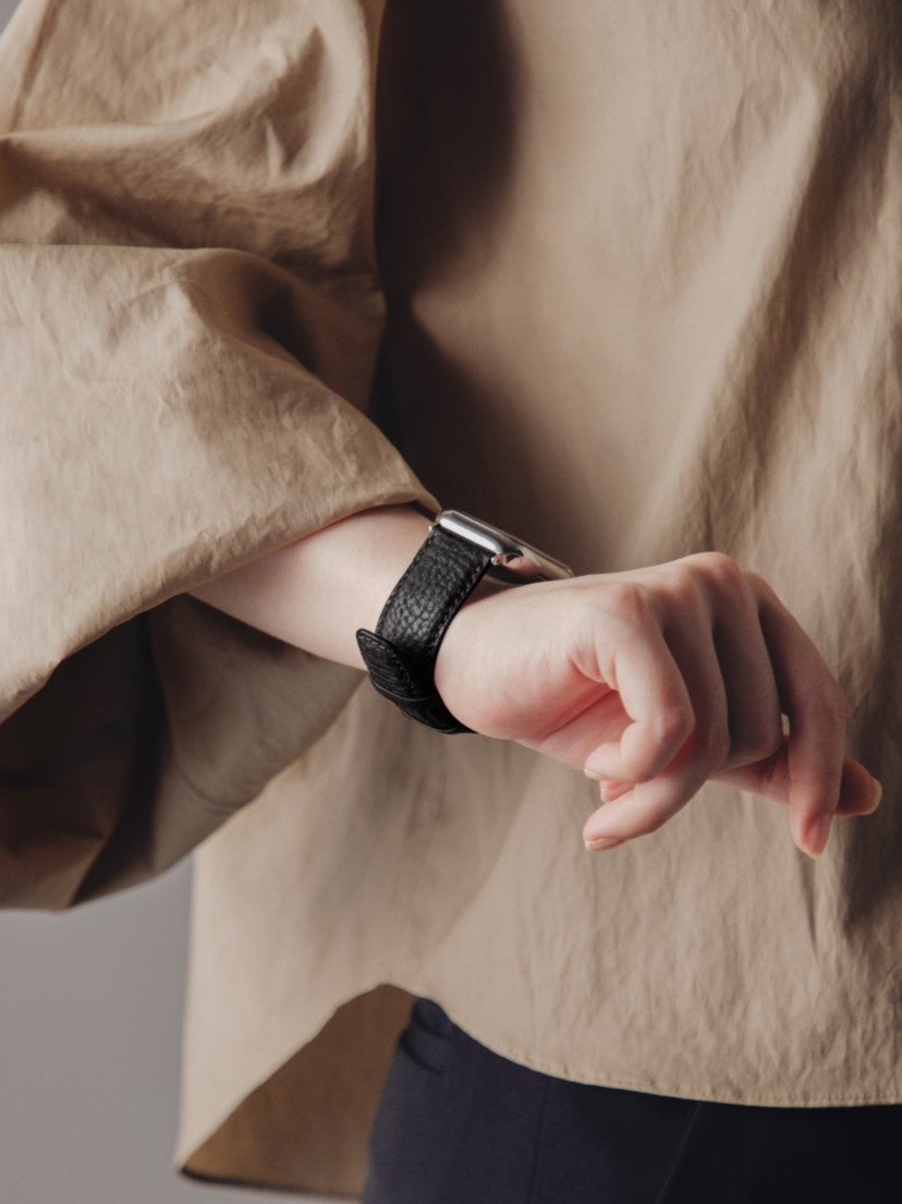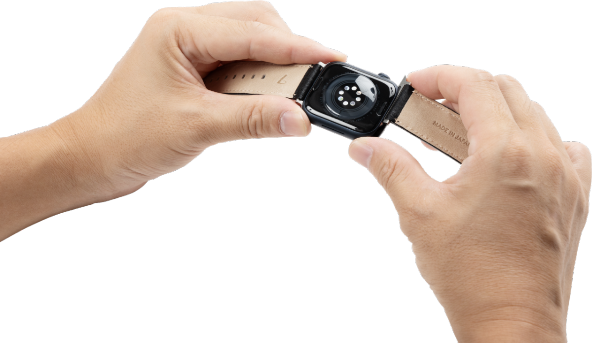 Apple Watch42・44・45mm用と38・40・41mm用の2タイプを展開。長さは男女問わずお使いいただけるよう、9段階で調整可能です。挿し込みながらスライドさせるだけで、簡単に装着・脱着できるようになっています。