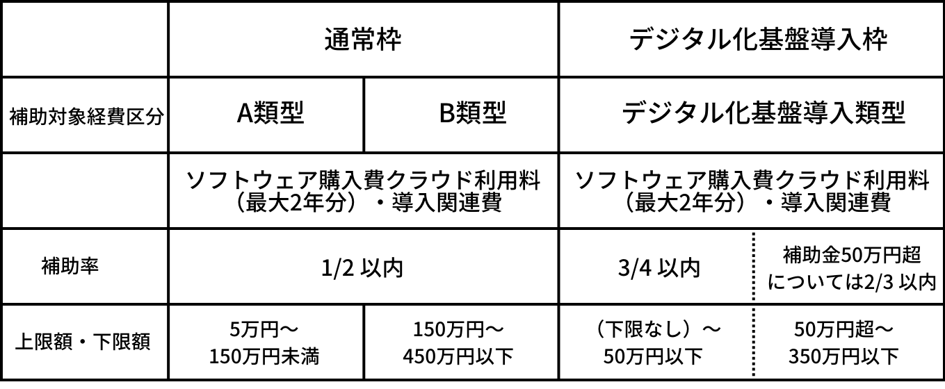 IT導入補助金は、中⼩企業・⼩規模事業者等の積極的なITツール(ソフトウェア、サービス等)の導入を支援し、生産性の向上を目的とする補助金です。 「いえらぶCLOUD」は「通常枠(A類型、B類型)」に加え、「デジタル化基盤導入枠」にも該当しています。「通常枠」では最大450万円(補助率1/2以内)、「デジタル化基盤導入枠」では最大350万円(補助率2/3以内)の補助金を受け取ることができます。