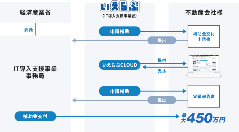 「いえらぶCLOUD」の導入を希望する不動産事業者は、導入時に最大450万円の補助金を利用することができます。いえらぶGROUPは、IT導入補助金の公式支援事業者です。