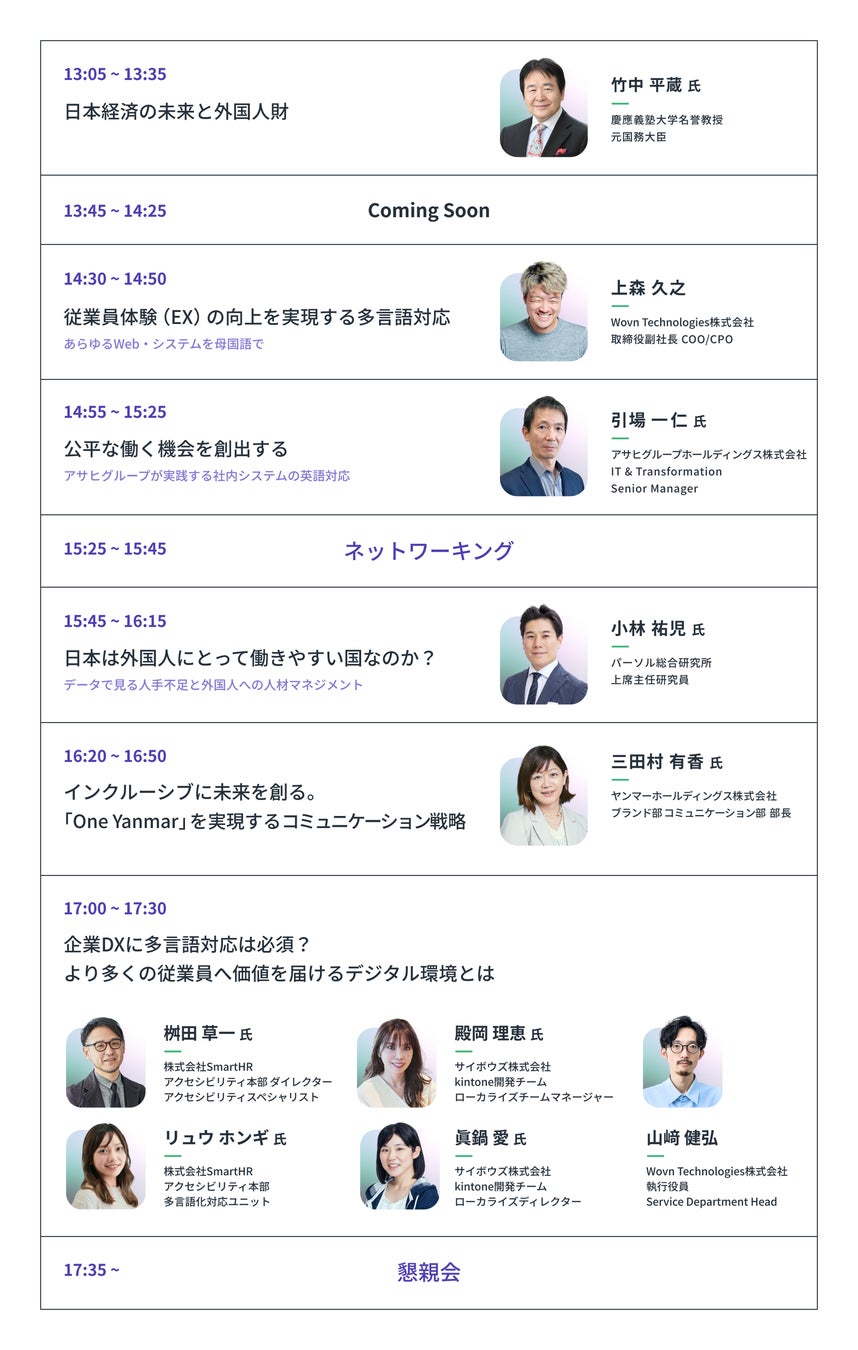また、社内業務システムやイントラネットなどの多言語化で「外国人従業員の公平性確保や活躍推進」を実現した企業事例として、アサヒグループホールディングス株式会社やヤンマーホールディングス株式会社によるセッションをご用意するとともに、WOVN からは「従業員体験を向上するための多言語化ベストプラクティス」をご紹介します。