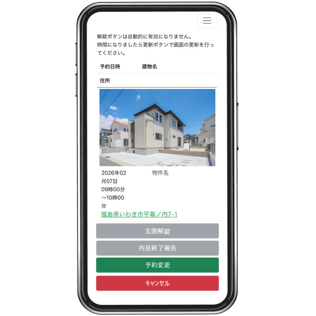 「いつでも無人見学会」は、WEB上で希望の見学日時を予約し、予約時間に直接現地を訪問。スマートフォンでスマートロックを開錠することで、非対面で内見ができるサービスです。アイダ設計担当が帯同しない非対面での内見だからこそ、お客様ご自身のペースで内見ができるほか、内見当日のお問い合わせ事項については、スマートフォン上にて「チャット」や「ビデオ通話」機能を用いることでリアルタイムにてご質問が可能です。