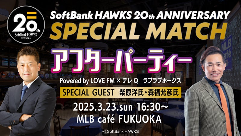 3月23日(日)の「SoftBank HAWKS 20th ANNIVERSARY SPECIAL MATCH」の後は福岡のFMラジオ局「LOVE FM」内の番組「テレQラブラブホークス」とコラボしてファンミーティングをMLB café FUKUOKA にて開催☆♪ホークスOB柴原洋さん、森福允彦さんによるトークショーを開催します!OB戦の裏話が聞けちゃうかも!チケットの発売は3月14日(金)10:00~! MLB café FUKUOKAのグルメを召し上がりながらイベントをお楽しみください♪