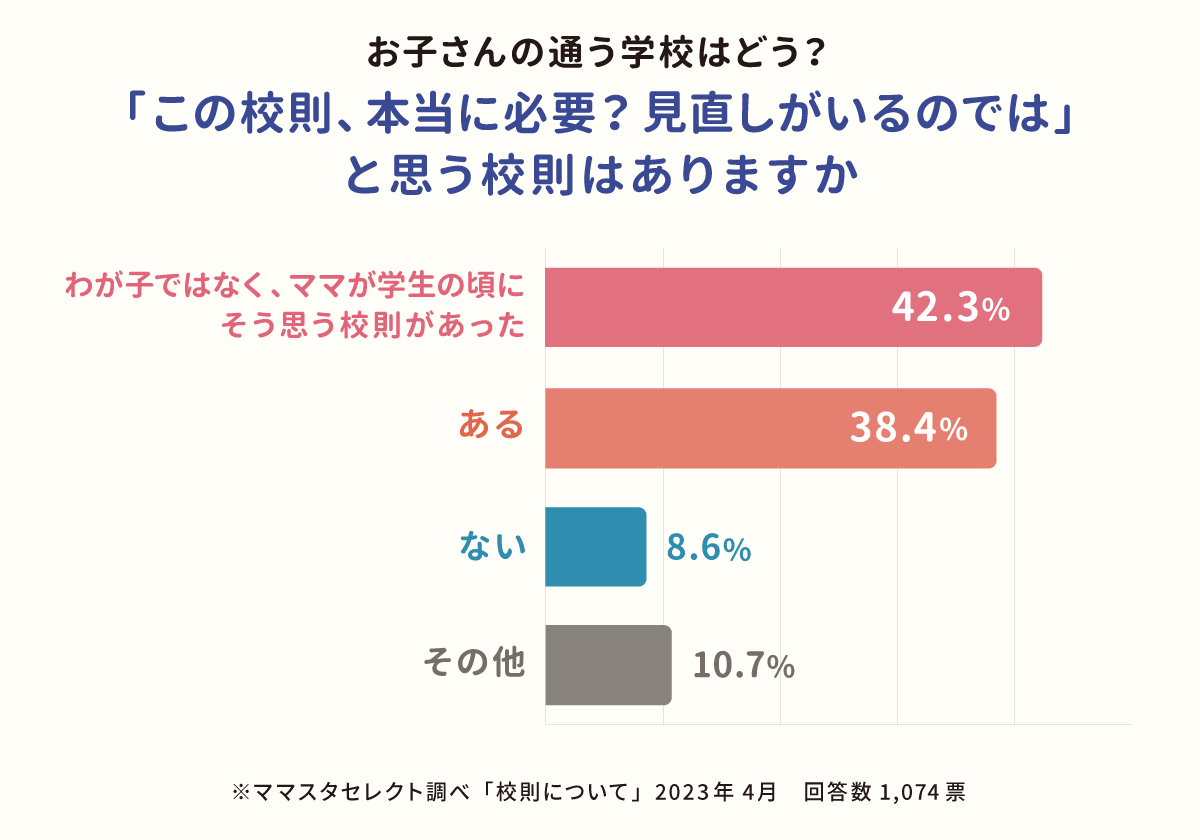今回ママスタセレクトに寄せられた回答数は1,074票。約42%は「わが子ではなく、ママが学生の頃にそう思う校則があった」と答えます。そして、現在お子さんの通う学校で見直しが必要と思う校則が「ある」を選択したママは約38%、「ない」と考えたのは約9%。のこりの約11%は「その他」でした。