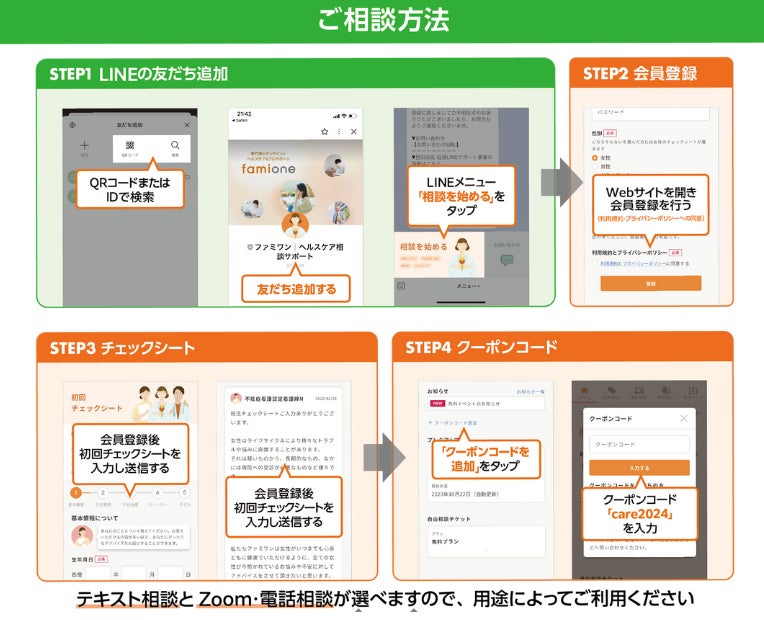 ファミワンLINE公式アカウントを登録し、クーポンコードを入力、初回チェックシートを提出後にテキスト相談またはビデオ通話で、当社在籍の専門家との相談が可能です。
