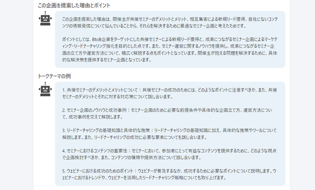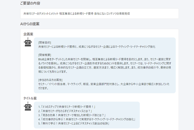 平均2時間以上かかっていたセミナー企画の作成を最短1分で作成することが可能です。サービス、ターゲット、過去実施のセミナーテーマ、訴求キーワードなどのインプットから、企画構成、セミナータイトル案、トークテーマ例、企画のポイントなどをアウトプット。新たな切り口での訴求や業務効率化に繋がります。