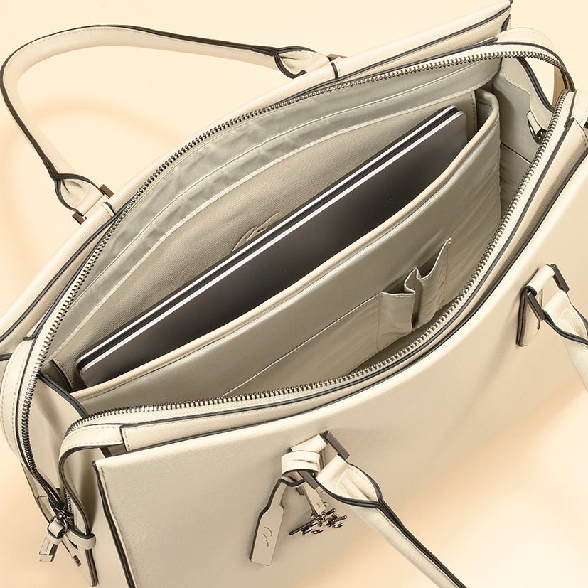 A4 FILE サイズには「PCスリーブ」付き。水濡れから守るフラップを被せることができて安心です。ファスナーを開けなくてもマグネット式フラップから直接出し入れできます。