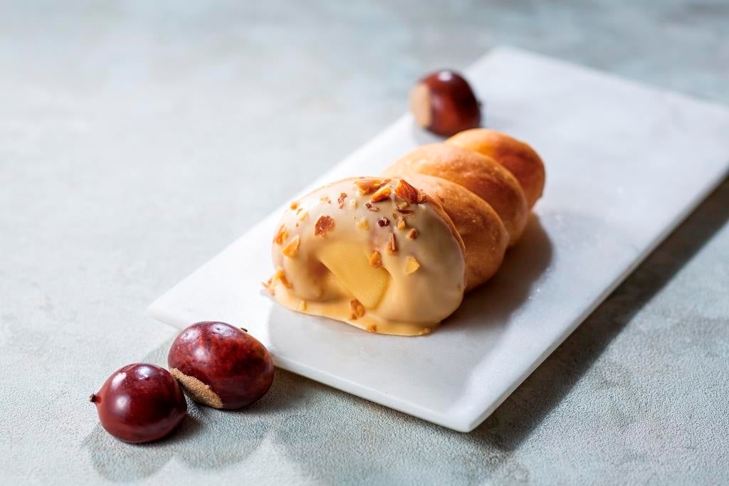 ゴディバのチョコを使用したガナッシュとマロンクリームを詰め込んだ秋限定の栗のコロネ。仕上げにキャラメル風味のチョコをコーティングし、香り豊かなローストアーモンドをトッピング。(二子玉川店では取扱いがございません)