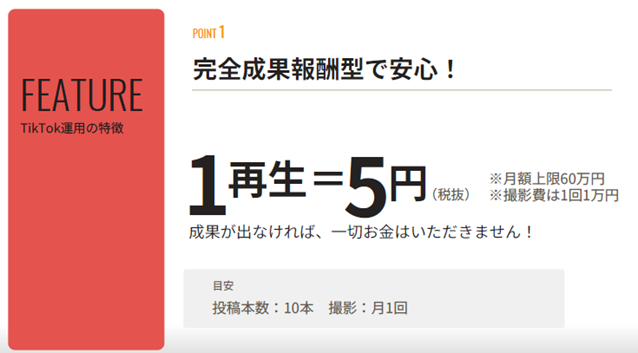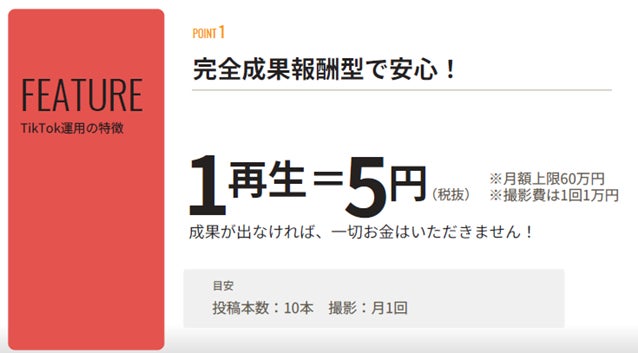 また料金も「1再生=5円(税込)」で月額の上限も60万円と安心してご利用いただける設定となっております(※撮影費用は1回につき1万円、月間1回撮影で10本の投稿を想定しております)。また動画本数の増加など、様々なニーズに柔軟に対応できるプランとなっています。