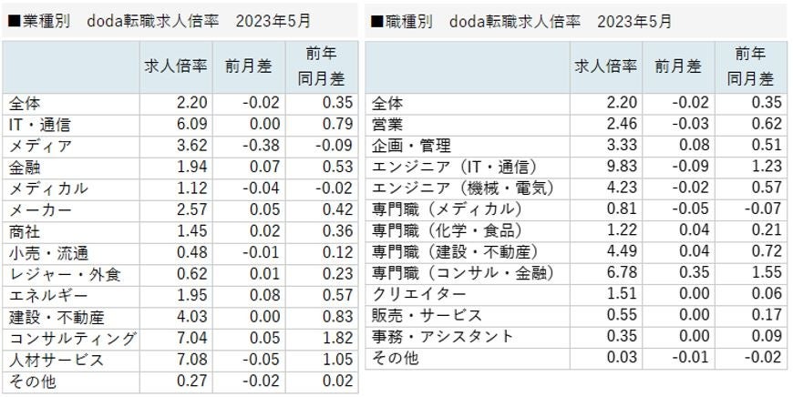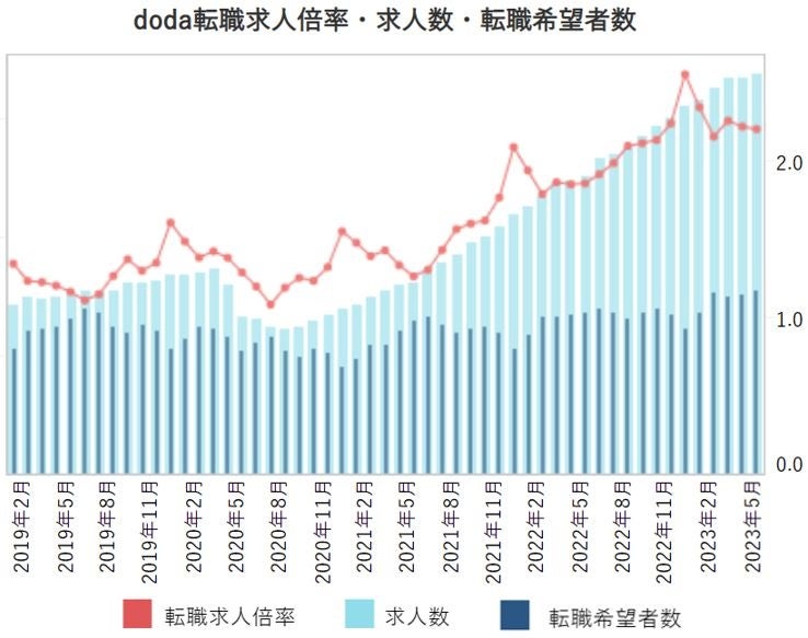 doda転職求人倍率2023年5月は2.20倍(前月差-0.02ポイント)
