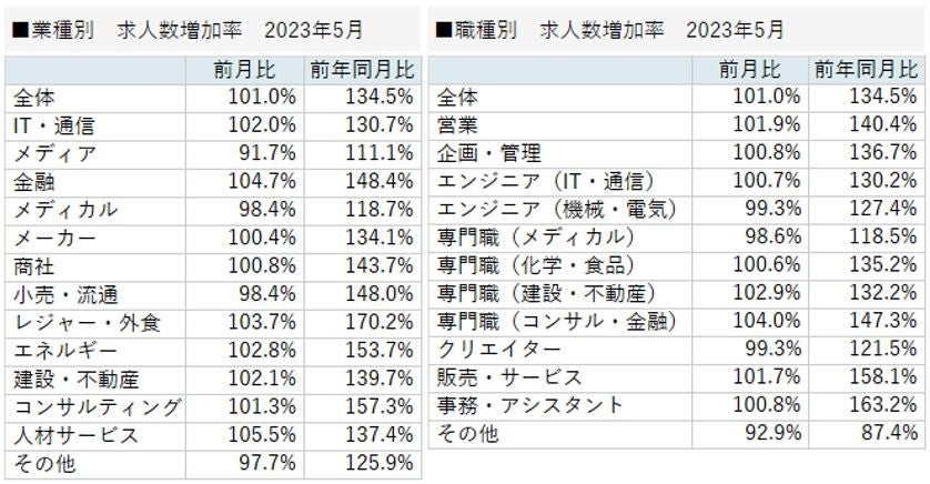 2023年5月の転職求人倍率は、前月から-0.02ポイントの2.20倍となりました。求人数は前月比101.0%、前年同月比134.5%となりました。転職希望者数は前月比101.8%、前年同月比113.3%でした。