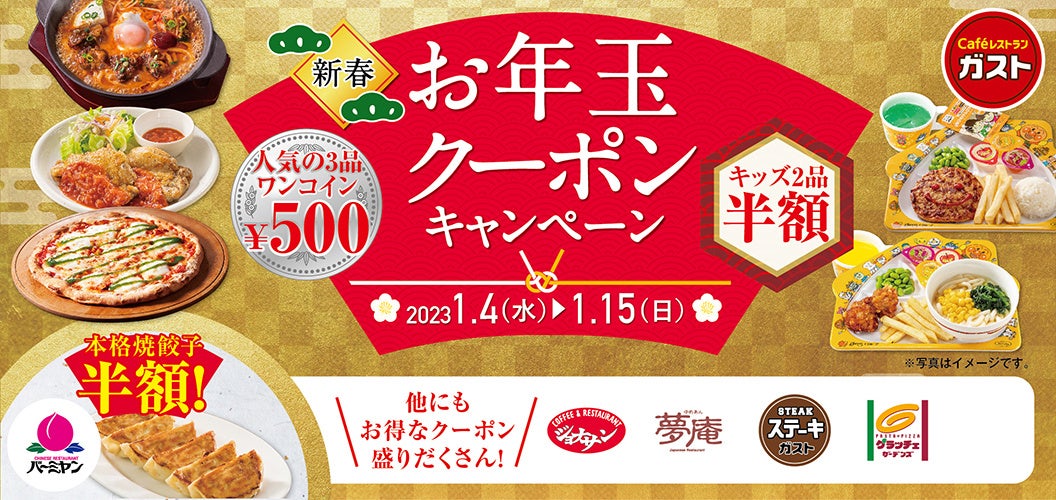 【ガストなど6ブランド総数52品】お年玉クーポンキャンペーン開催!ガストの人気3品が“ワンコイン”!バーミヤン餃子は“半額”に!