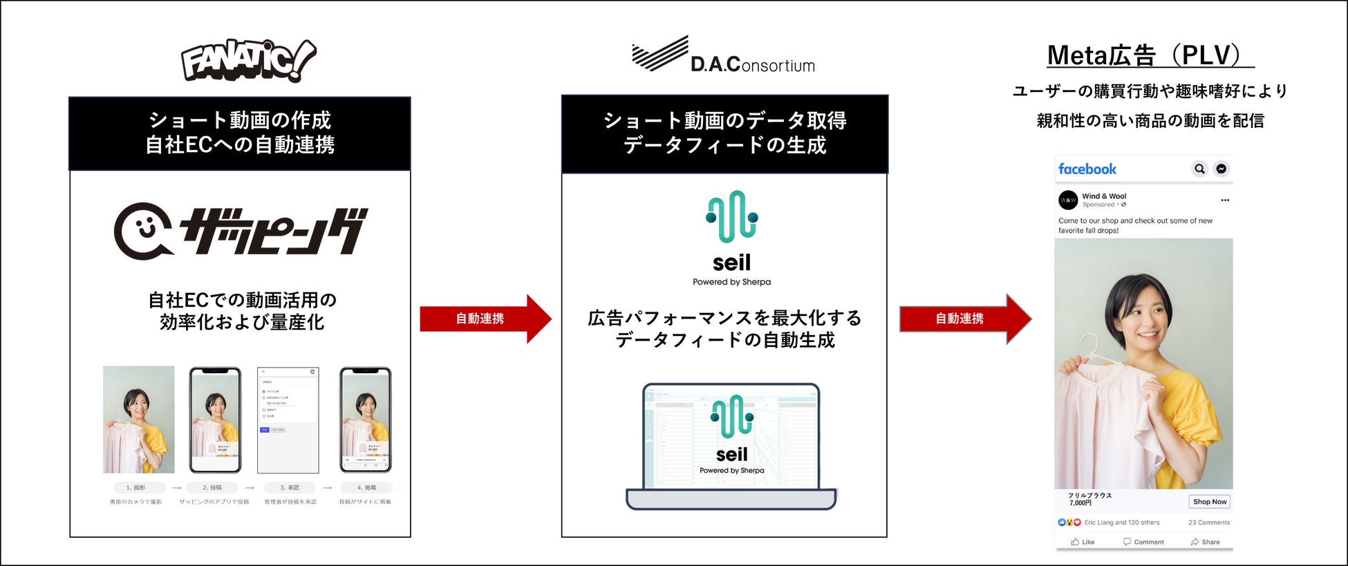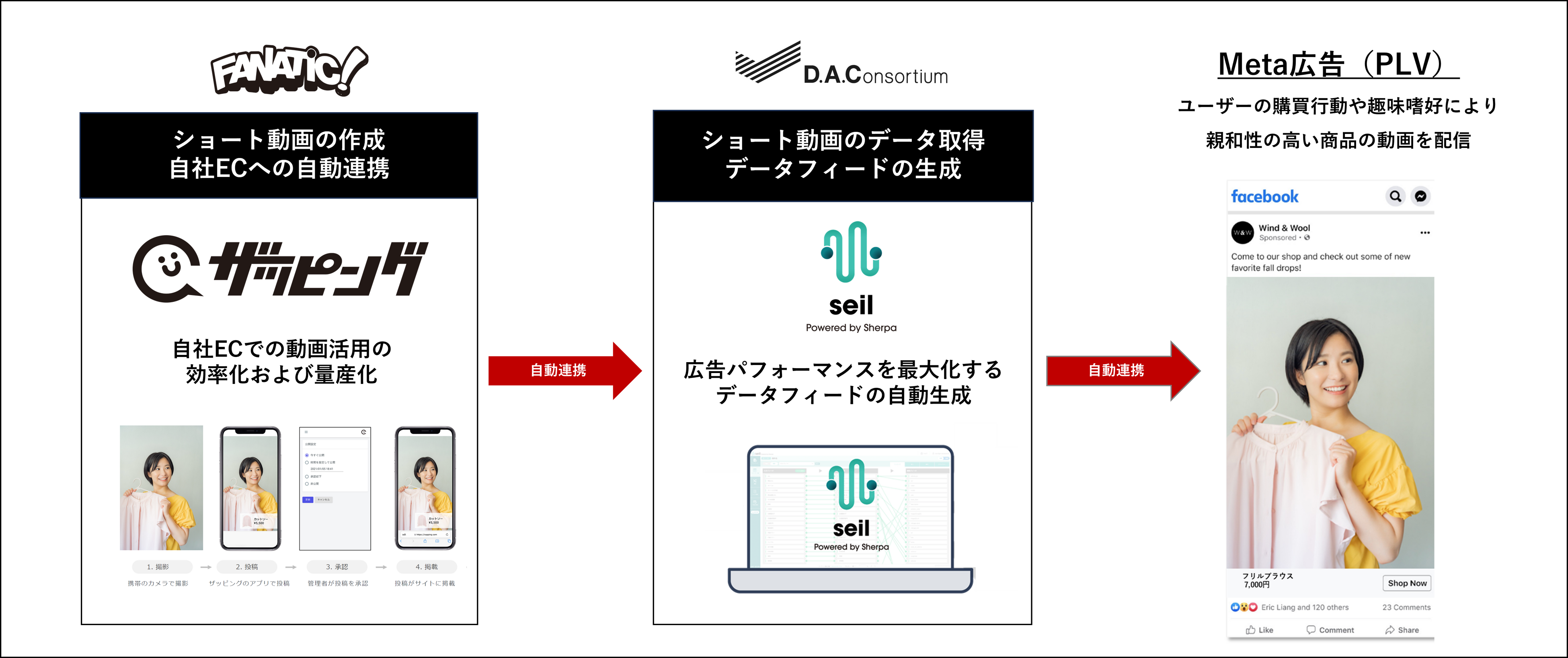 このたび、「ザッピング」と「seil」が連携し、「ザッピング」を経由して自社ECに掲載中のショート動画をダイナミック広告へ自動連携することが可能となりました。これにより、さらに効果的な広告活用を促し、企業の売上促進を実現します。