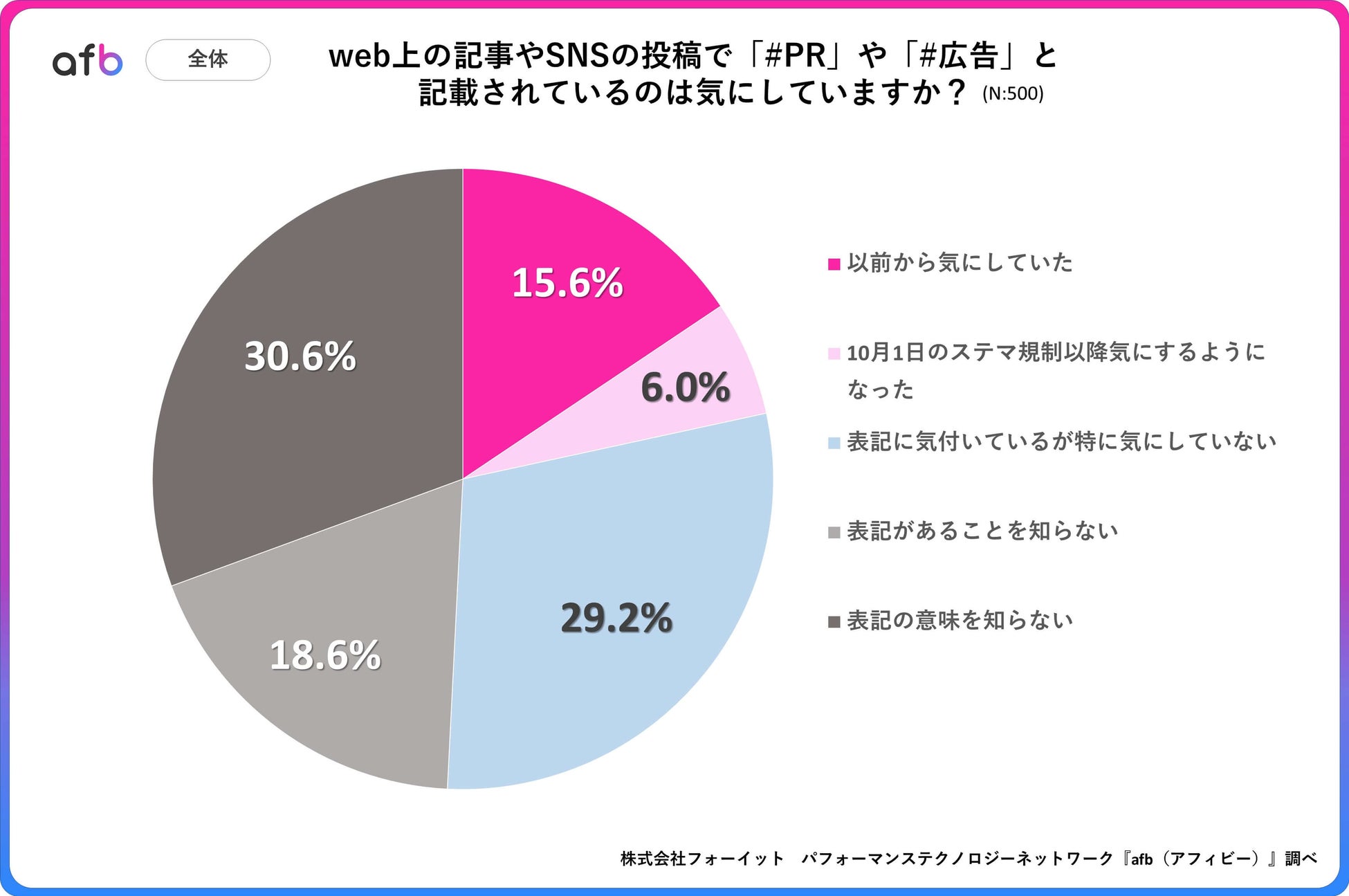 パフォーマンステクノロジーネットワーク「afb(アフィビー)」< https://www.afi-b.com/ >の開発運用をおこなう株式会社フォーイットは、全国の10代~60代までの男女500人を対象にPR表記に関するアンケートを実施し、年代別・職業別等の特徴についてまとめました。