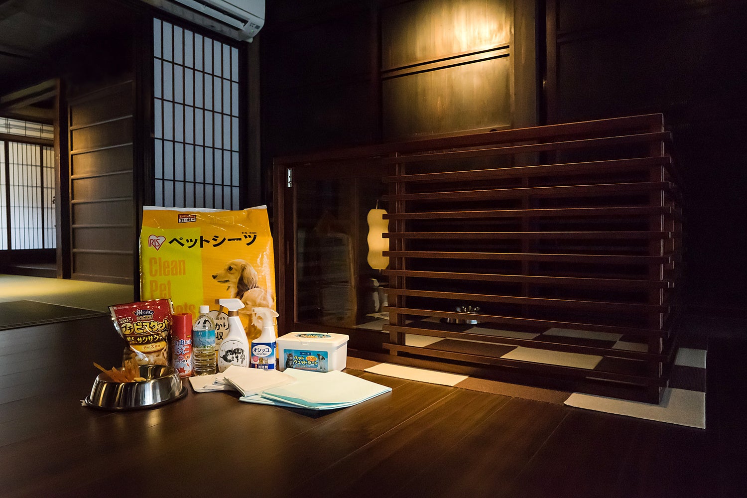 ケージ、フードボウル2枚、わんちゃん用おやつ、わんちゃん用バスタオル、わんちゃん用シャンプー、トイレシート、散歩用エチケット袋、ウェットティッシュ、消臭除菌防虫スプレー、防臭ごみ箱、粘着ローラー