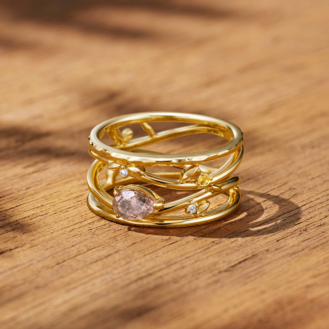 ストロベリークォーツとスモーキークォーツ、キュービックジルコニアで魅せる秋らしいカラーが美しいシリーズも。エレガントなデザインのロングネックレスは、トップの取り外しや長さ調整も自在なので、その日の装い次第で自由に印象を変えてお楽しみいただけます。リングセットは葉が舞い踊っているようなリズミカルな地金のラインに、ストロベリークォーツを主役にした360度どこからでも美しいデザインが魅力。リングを重ねる向きによってストレートの幅広リングとしてもウェーブの幅広リングとしても着用できます。それぞれをお手持ちのリングと合わせてバラバラにも使用でき、1セットで様々なコーディネートをお楽しみいただけます。