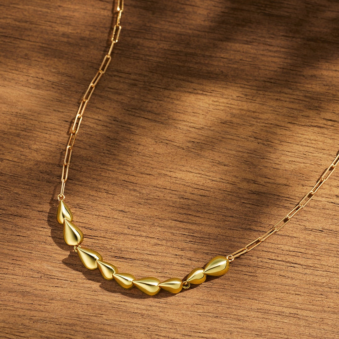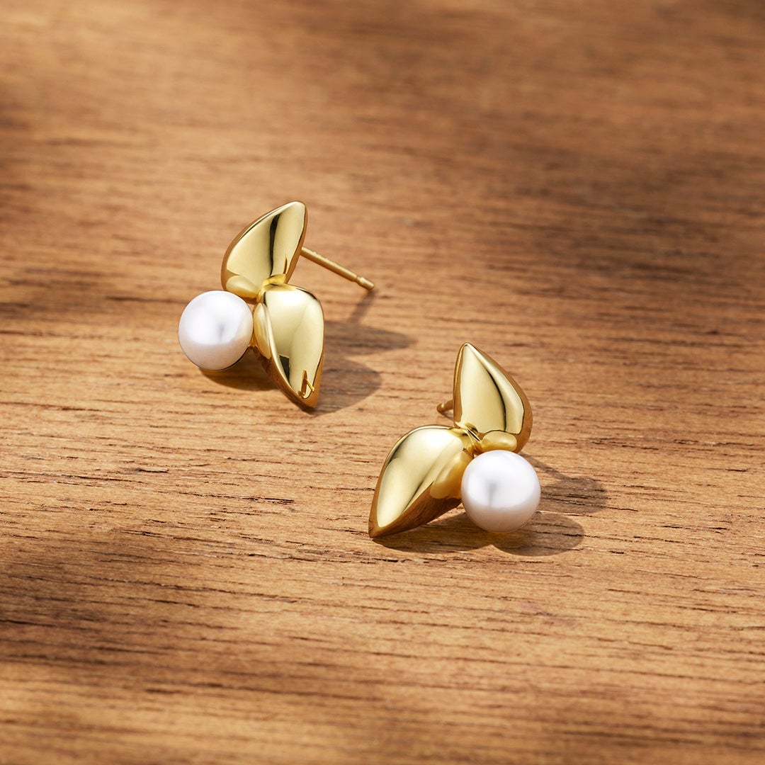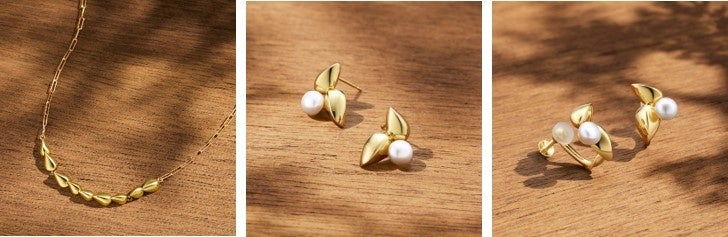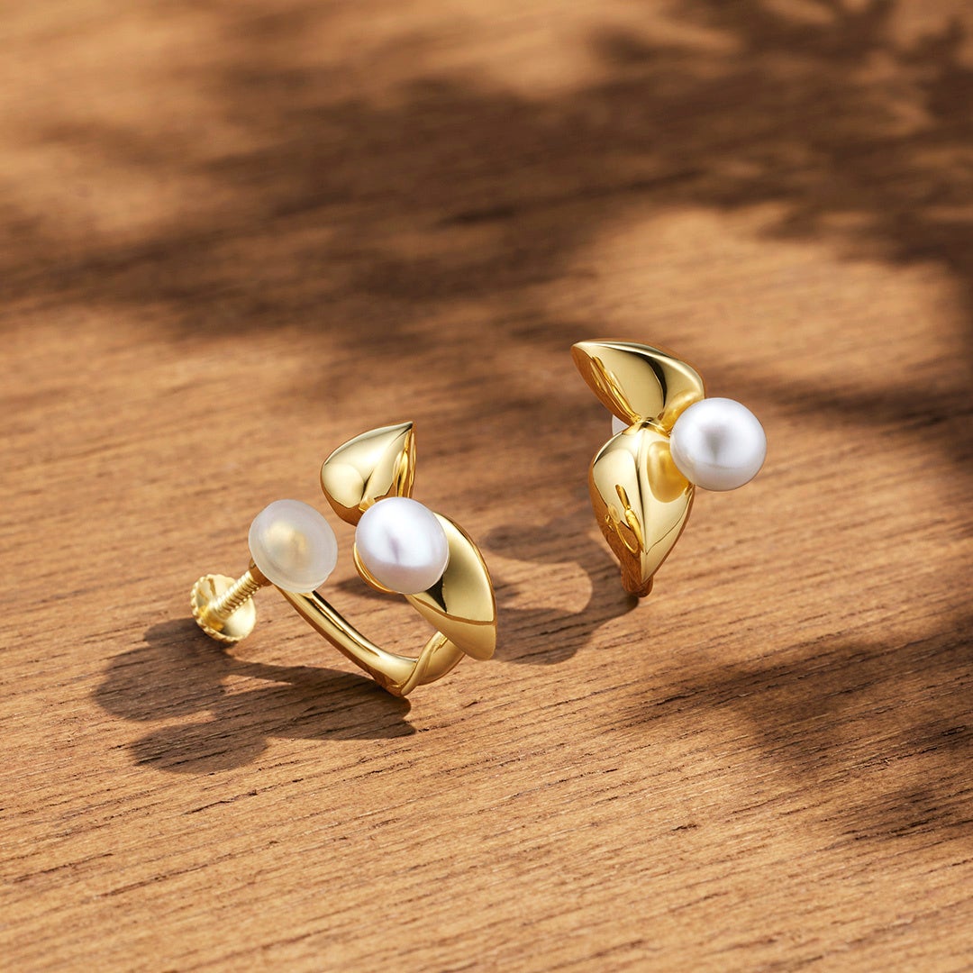 立体的なリーフをリズミカルに連ねたネックレスやピアスもご用意。イエローゴールドカラーの地金が光を受けてきらめく様子は、穏やかで華やかな秋の情景を連想させます。さらに抜け感のあるクリップチェーンが、スタイリッシュかつ新鮮なアクセントをプラス。同じくリーフデザインのピアスやイヤリングは、「月のしずく」とも呼ばれるパールをセンターに迎え、華やかな印象に落とし込みました。